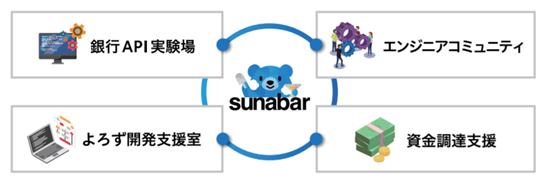 現在、sunabarは、国内銀行初の常時開放したAPI開発のテスト環境である「銀行API実験場」と、開発者が集う「エンジニアコミュニティ」、銀行機能や新技術提供などシステム面から新規ビジネスの機会創出を支援する「よろず開発支援室」、資金面から開発支援を行う「資金調達支援」の4つの役割をもち、お客さま企業のサービスへ付加価値を提供しています。