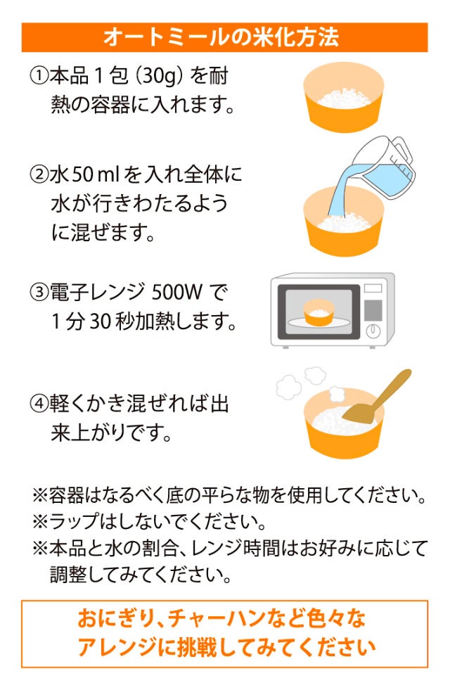 本品を電子レンジで加熱するだけで、簡単に米化したオートミールが出来上がります。