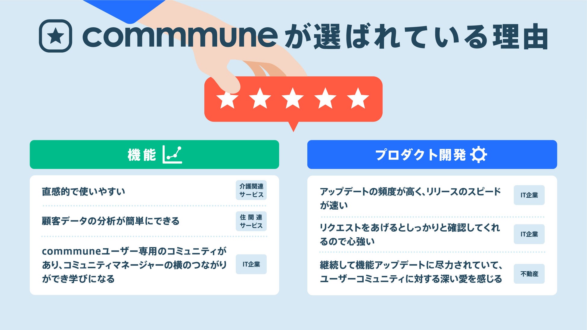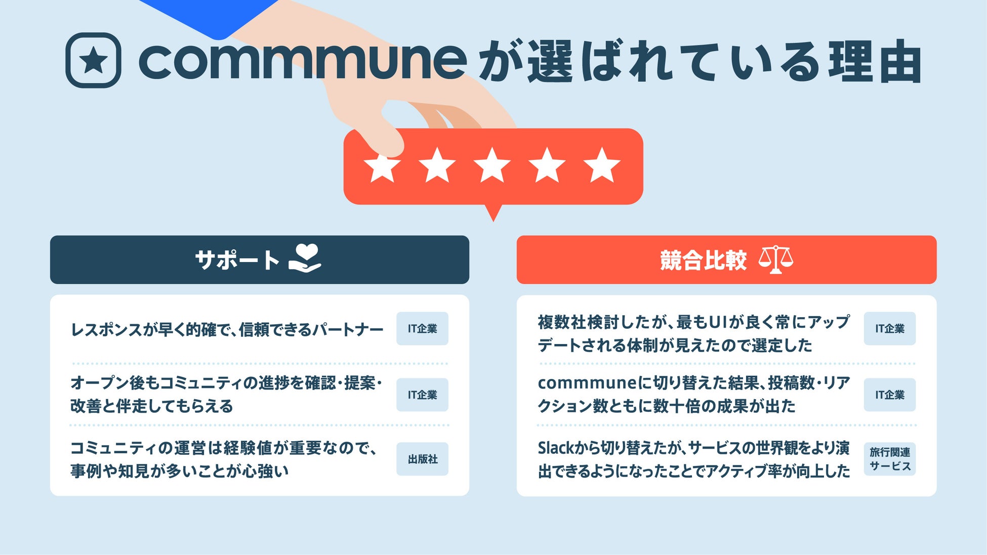 コミューンは、お客様のコミュニティサクセスとそれによる事業貢献という「成果が出るプラットフォーム」としての役割にこだわり、企業とユーザーが融け合う社会の実現に向けて進化を続けてまいります。