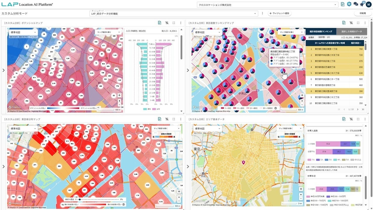 クロスロケーションズ株式会社(本社 :東京都渋谷区、代表取締役:小尾 一介、以下「クロスロケーションズ」)は、自社開発の人流データ分析プラットフォーム「Location AI Platform®(以下、LAP)」において、企業が保有する各種データや外部データを地図上で統合・可視化・分析できる新機能「統合データ分析機能」を正式リリースしました。これにより、店舗運営、販売戦略、CRM施策、施設配置、潜在顧客把握、など多様な目的において、人流とエリアを起点としたデータ分析による意思決定を飛躍的に高度化できます。LAPは先に実装した生成AI機能に加えて、本機能の追加により「実世界の人々の動き」を精度高く分析できるプラットフォームとなりました。LAPユーザーは追加の費用なくこれらの機能を利用できます。