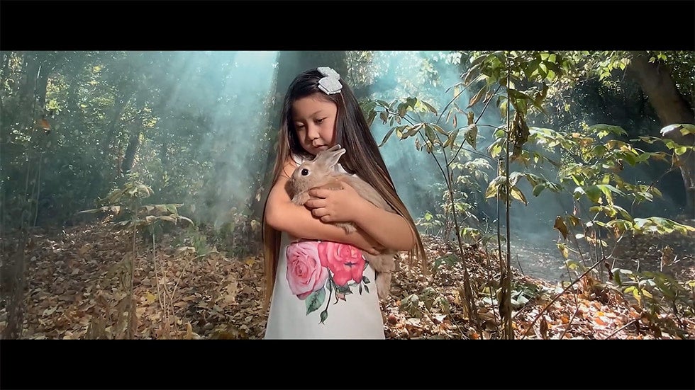 アマンダが森を行く。小川のせせらぎを聴き、全身で自然を感じながら。ウサギを見つけ、捕まえようとすると突然。。。