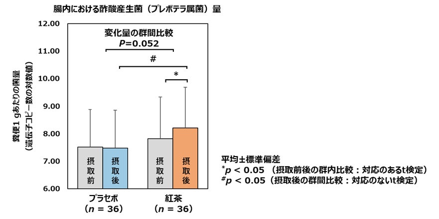 酢酸産生菌の1つであるプレボテラ属菌は、炭水化物(糖質や食物繊維)の摂取量が多い食生活の人の腸内でよく見られる腸内細菌であり、腸内で炭水化物を分解して短鎖脂肪酸を産生する能力が高いことが知られています。そのため、紅茶の飲用によるプレボテラ属菌の増加は、食事から摂取した未消化の炭水化物の利用を改善し、健康の維持増進に役立つ可能性があります。
