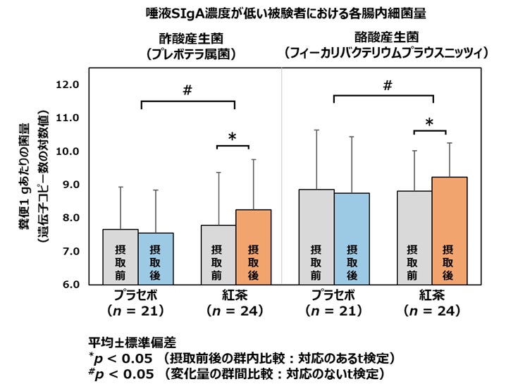 また、口腔内において粘膜免疫機能を担う免疫物質(唾液SIgA)濃度が低い人では、紅茶の飲用により唾液SIgA濃度が上昇することが分かっています1)。そこで、本研究でも同様に、唾液SIgA濃度が低い人を対象として、習慣的な紅茶飲用による腸内細菌叢への影響を検証しました。