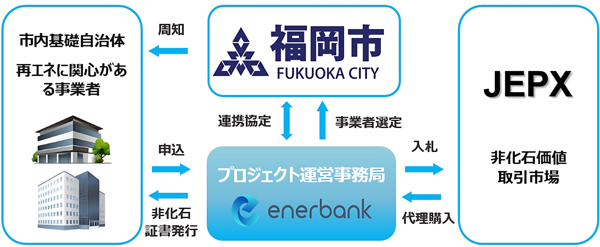 株式会社エナーバンク(共同創業者 代表取締役:佐藤 丞吾、本社:東京都中央区)は、福岡市が公募型プロポーザル方式により募集した「福岡市非化石証書の共同購入事業」において、当社は支援事業者として選定されました。