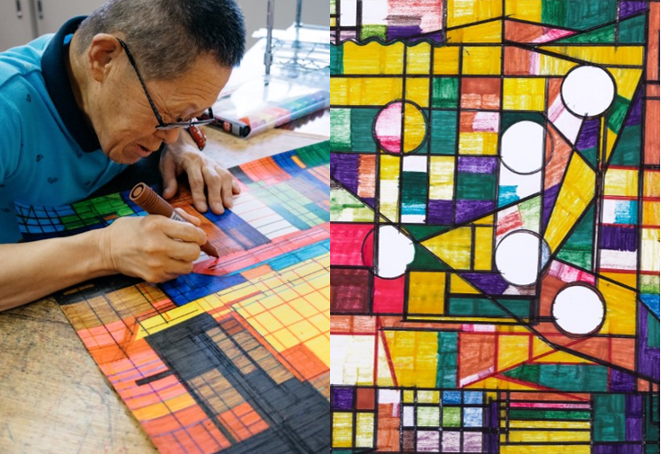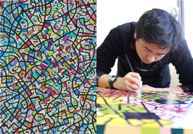 フランスでの作品展示や国内の美術館の出展など、実績がある。彼の描く作品は幾何科学模様、風景画、様々なタッチで描かれる。作品のほとんどは筆一本で描く。同じ作品を約20-30点描くと、今度は全く違う描き方で、新たなキャンバスに表現していく。