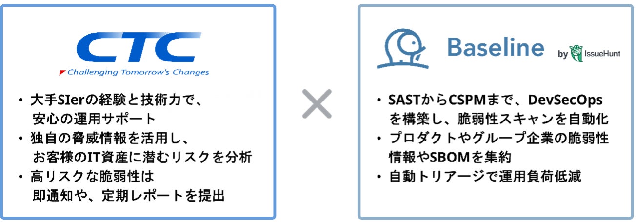 IssueHunt株式会社(代表取締役社長:横溝 一将、本社:東京都中央区、以下:IssueHunt)と伊藤忠テクノソリューションズ株式会社(代表取締役社長:新宮 達史、本社:東京都港区、略称:CTC)は、業務提携契約を締結し、脆弱性情報の収集・分析サービス「Baseline for CSIRT」を提供します。本サービスを通じて、企業のIT資産のセキュリティリスクの低減と安定運用を図り、脆弱性情報の悪用によるシステム被害を予防します。