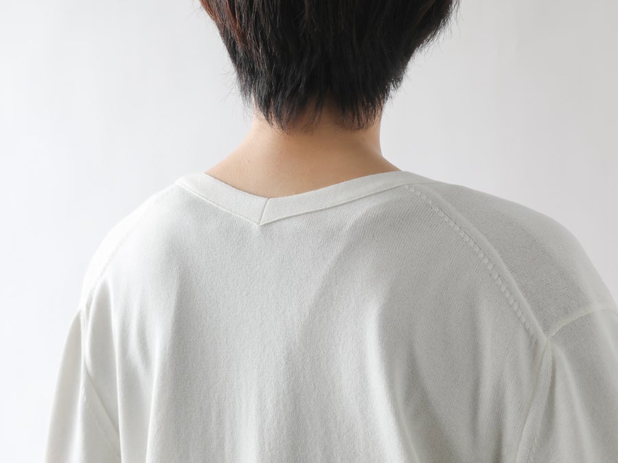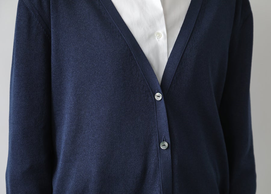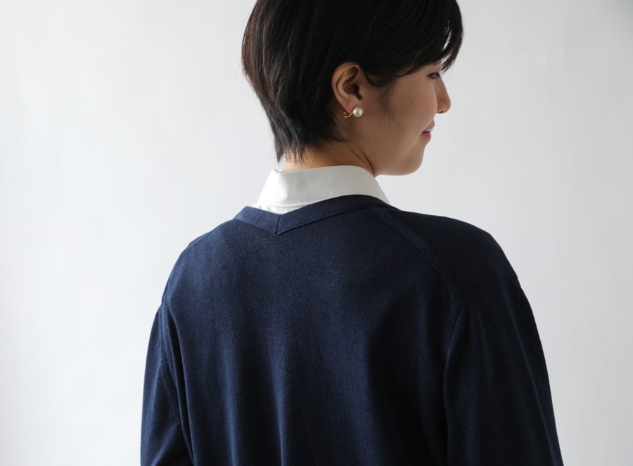 中に着るものを選ばないよう、Vの形が深くなりすぎないようにこだわりました。