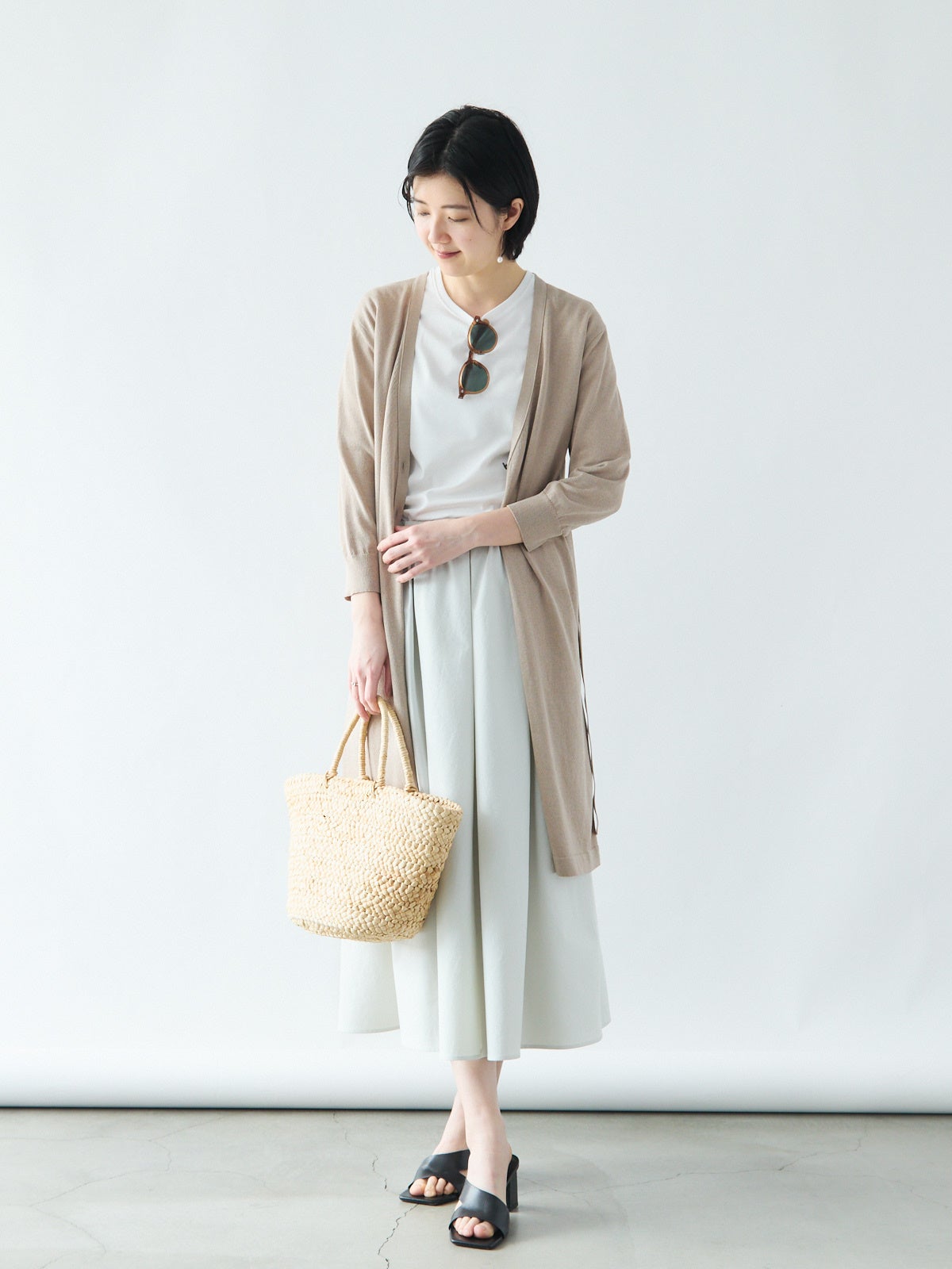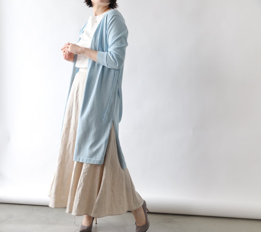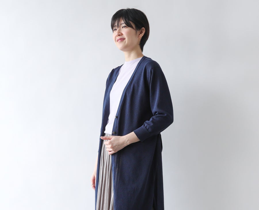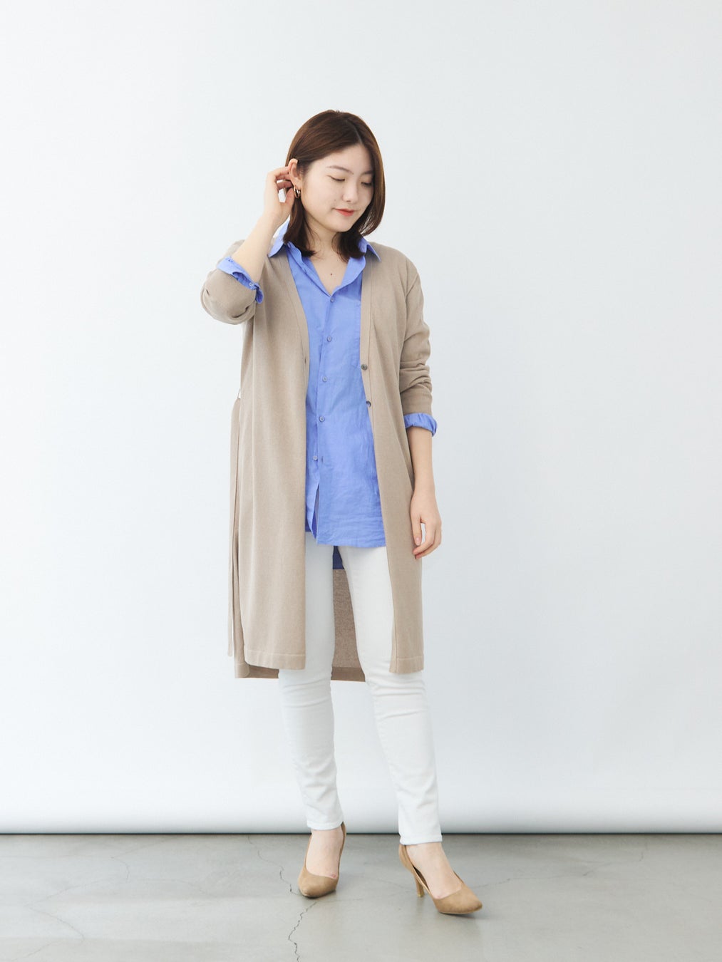 この前後差のおかげでロングカーディガン特有の重たさがなくなって軽やかな印象に。