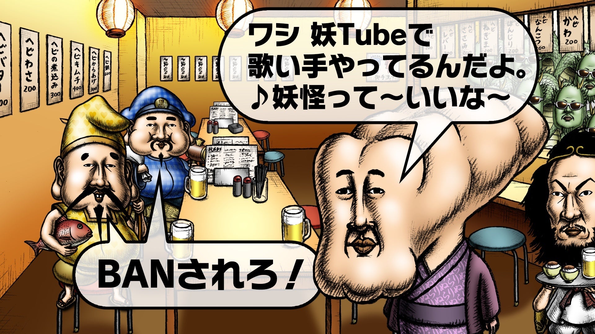 妖怪事情について語るぬらりひょん。 人間から注目されることで妖力を貯める妖怪たちは、より過激なことをする人間のYouTuberの登場で、注目を集めるのに苦労しているようで……