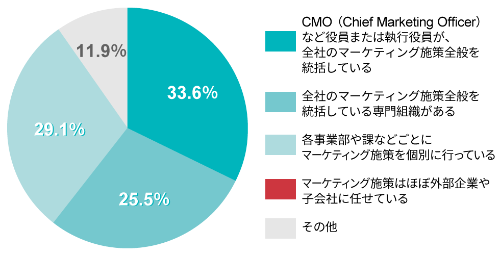 まず、経営判断をダイレクトにマーケティング施策に反映するために、CMOを任命するなど、役員または執行役員に全社のマーケティング施策全般を横串で統括させる体制を既に敷く企業は、全体の33.6%でした。専任の役員はいないものの、「マーケティング本部」など、全社のマーケティング施策全般を統括する専門組織があると答えた企業も25.5%ありました。一方、外部企業や子会社に任せているとした企業は1社もありませんでした。