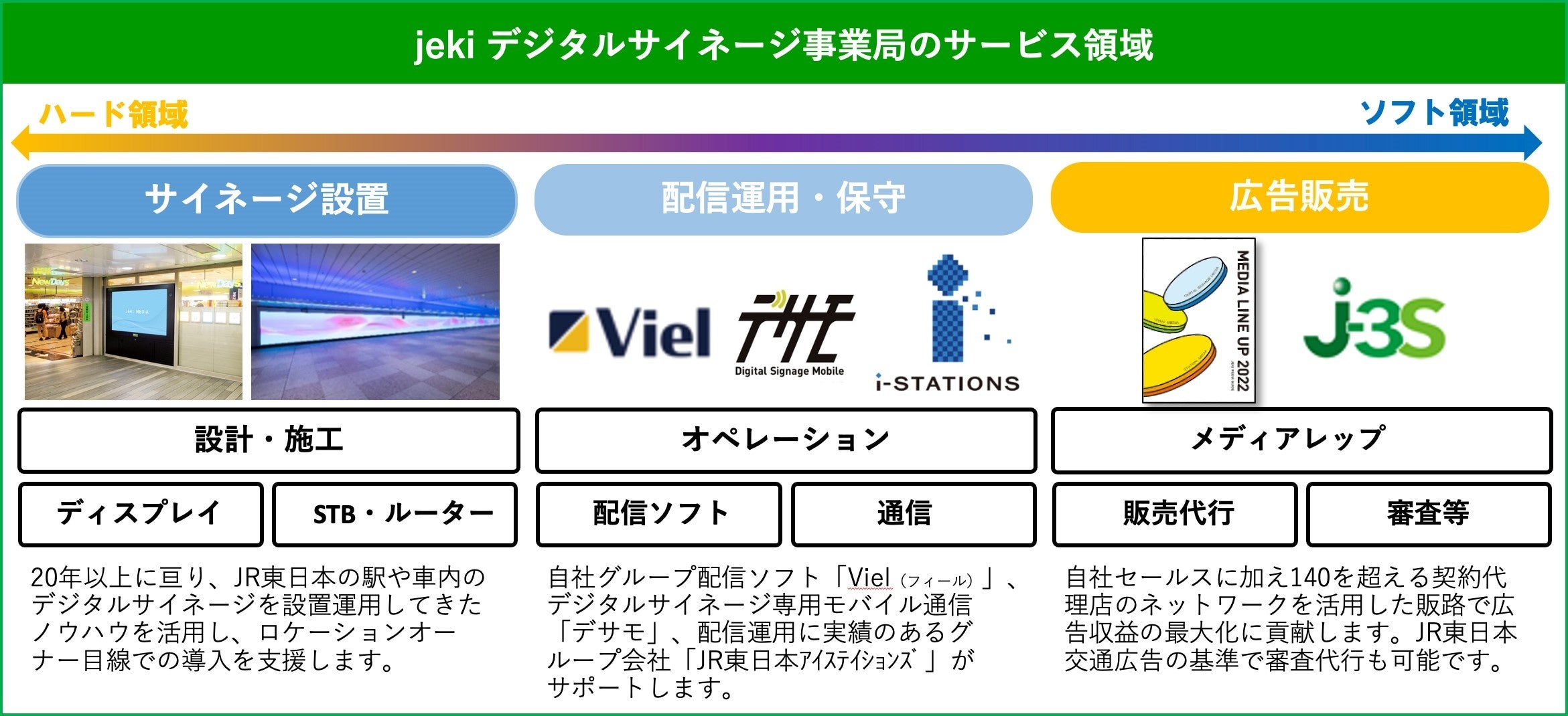 今後のデジタルサイネージの市場拡大を見据え、7月1日の組織改正で「デジタルサイネージ事業局」を新設し、本格的にデジタルサイネージに特化したメディアレップ事業を展開します。JR東日本グループの広告会社として駅や電車内などのデジタルサイネージを手掛けてきたjekiならではの知見を活かした、ロケーションオーナーやデジタルサイネージ関連事業者向けのサービスです。