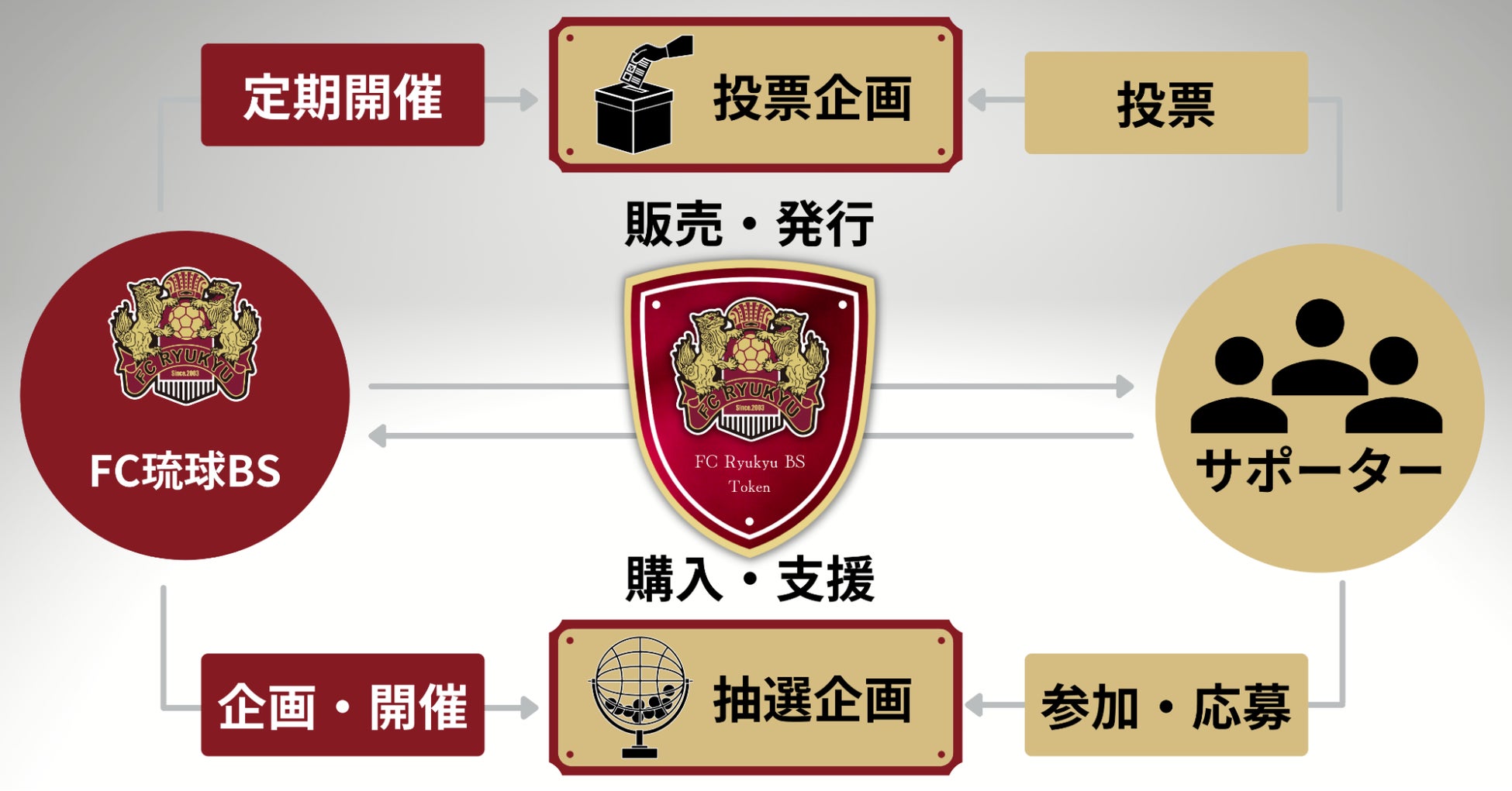 FC琉球BSトークンはクラブへの応援の「しるし」や「証」の役割を果たし、また単に支援の証になるだけでなく、保有することでクラブ発の投票企画への参加や、トークン保有者限定の特典への応募ができるなど、新しい体験ができるデジタル上のアイテムです。