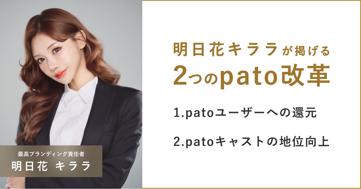 9月3日より、サービスLPのメイン画像などを変更し、今後明日花キララさんプロデュースのイベントや特典をpatoサービス内で実施していきます。