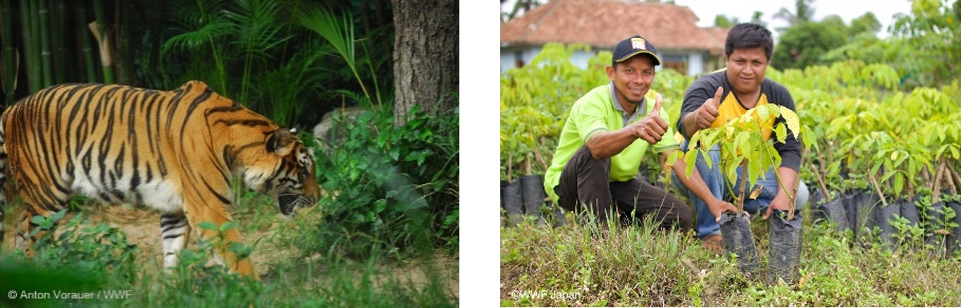 (右)持続可能な農業を推進するための活動を展開。森林保全など環境への配慮だけでなく、小規模な農家の生計向上への貢献も目指している(東南アジア)©︎WWF Japan。