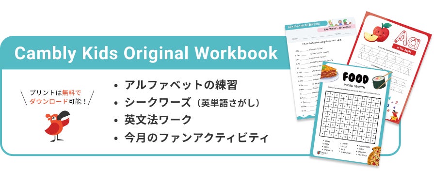 いまCambly Kidsに新規アカウントをご登録いただくと、特典として「オリジナルワークブック」をプレゼント!特典へのアクセスは、Cambly Kidsへの新規登録後メールにてお送りします。