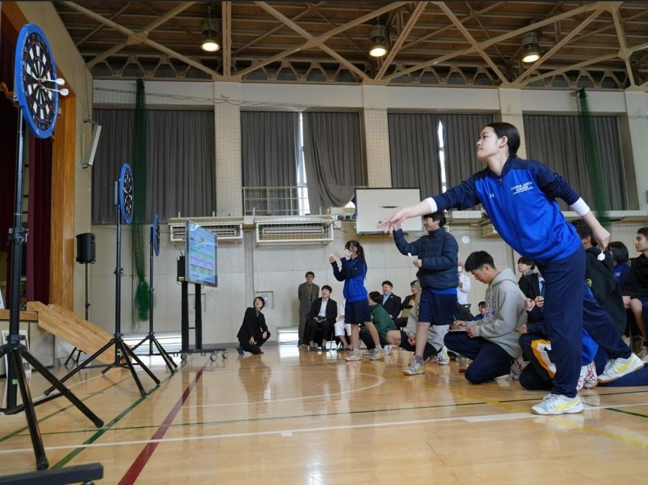 同プロジェクトは学校にダーツに必要な道具一式を提供。イベントに先駆け一年生から三年生までの全クラスの体育の授業でダーツを体験してもらい、予選にてクラス代表ペアを決定。イベント当日は全学年・全クラス対抗によるダーツ大会を催しました。