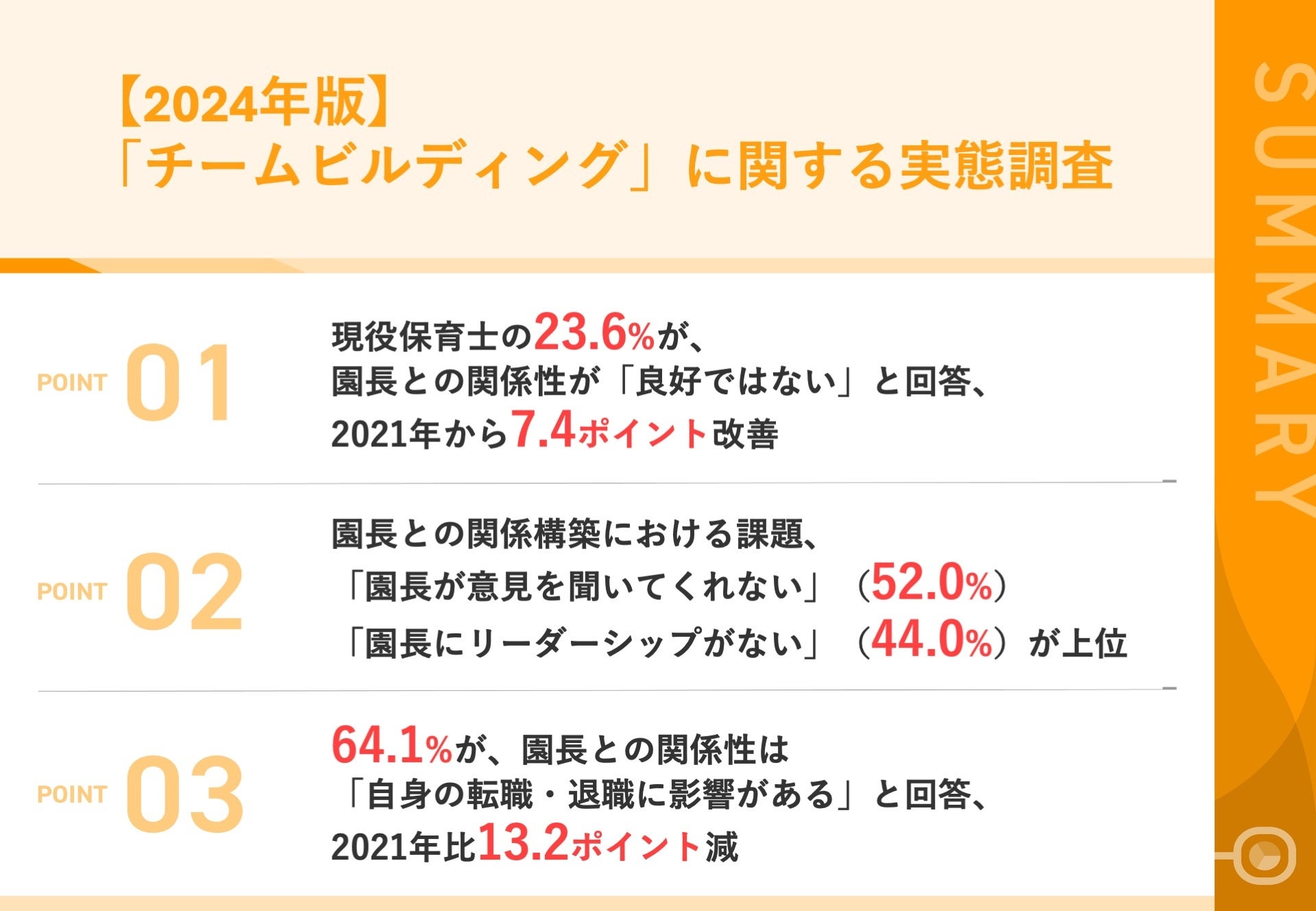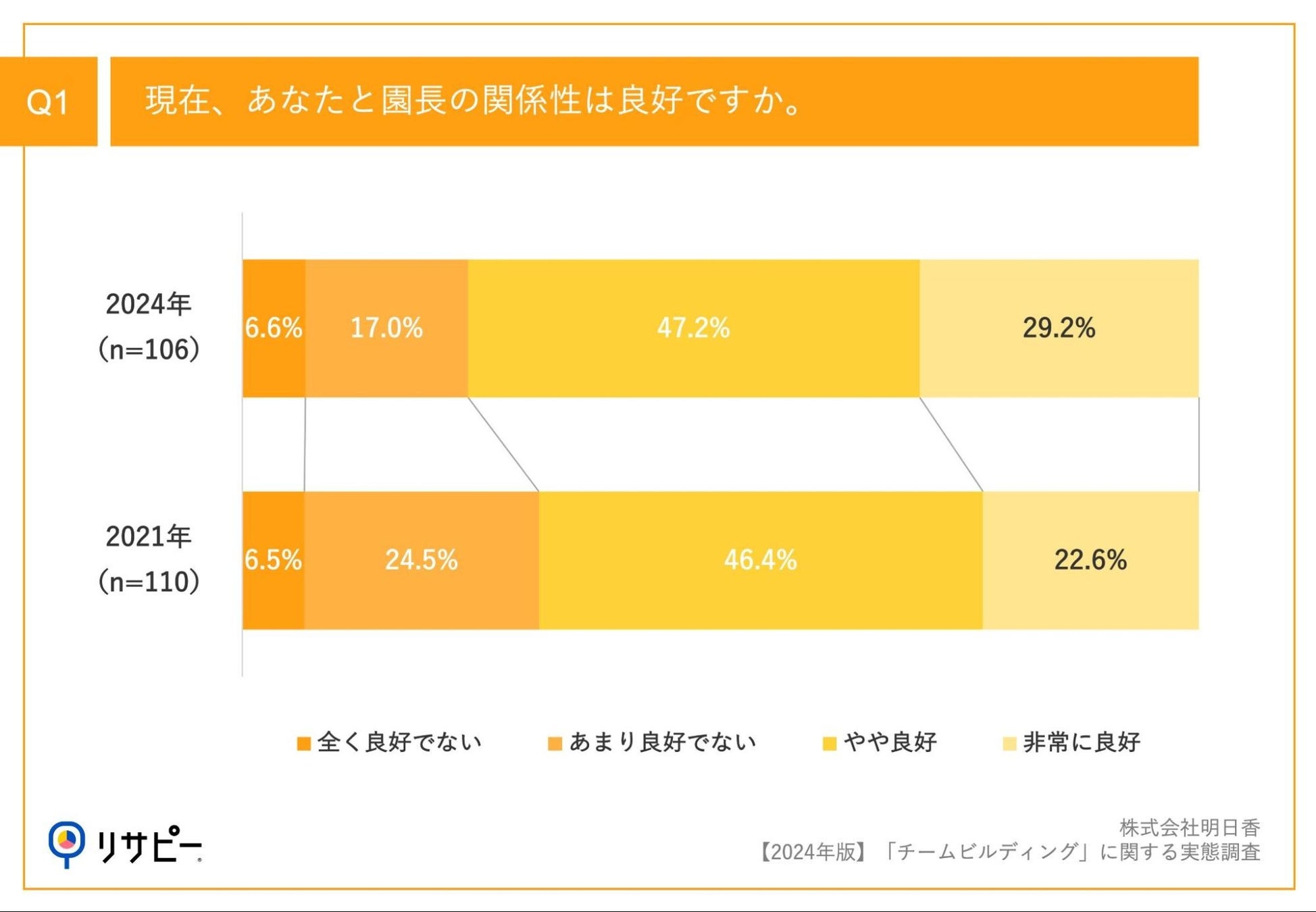 01|現役保育士の23.6%が、園長との関係性が「良好ではない」と回答、2021年から7.4ポイント改善