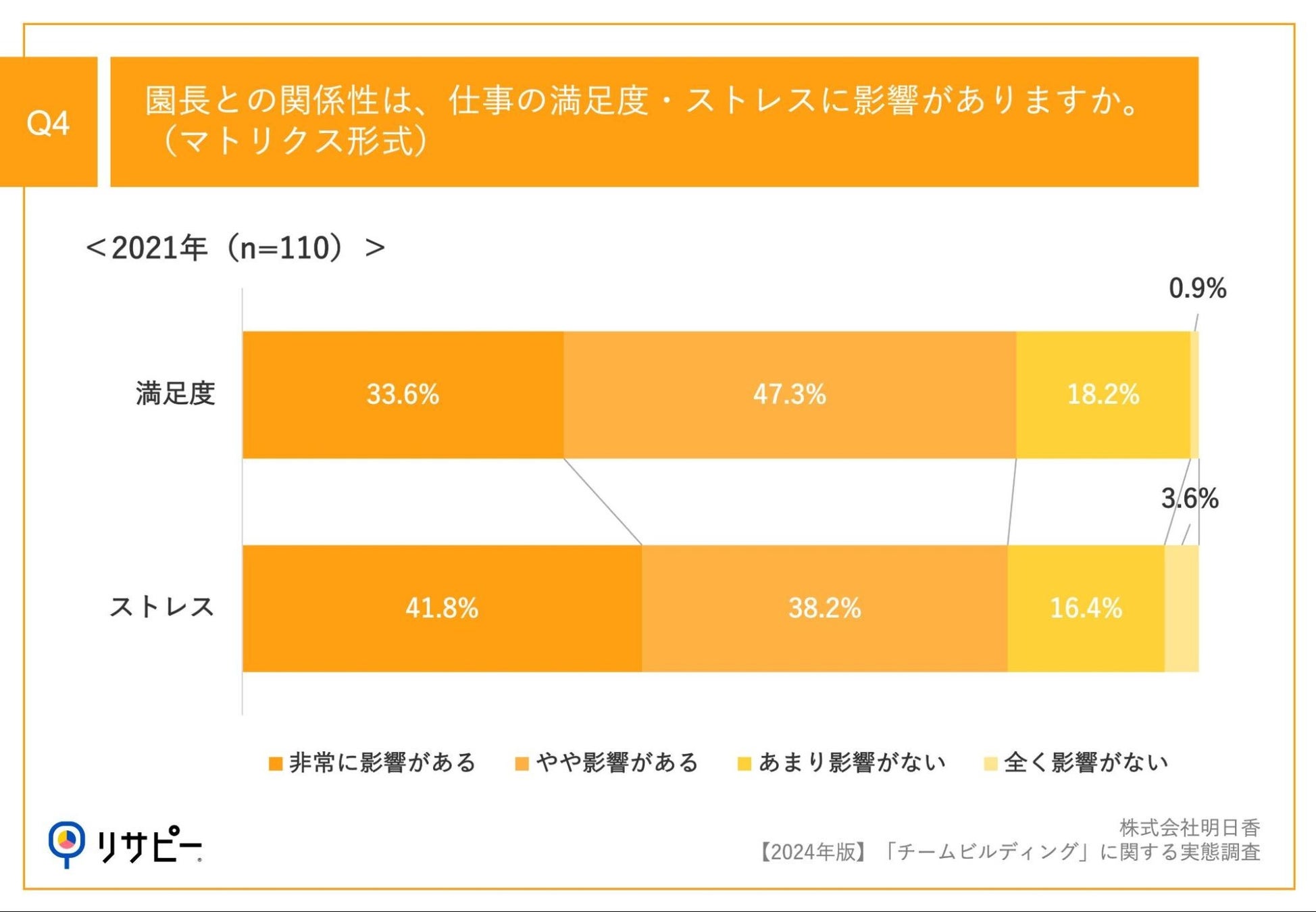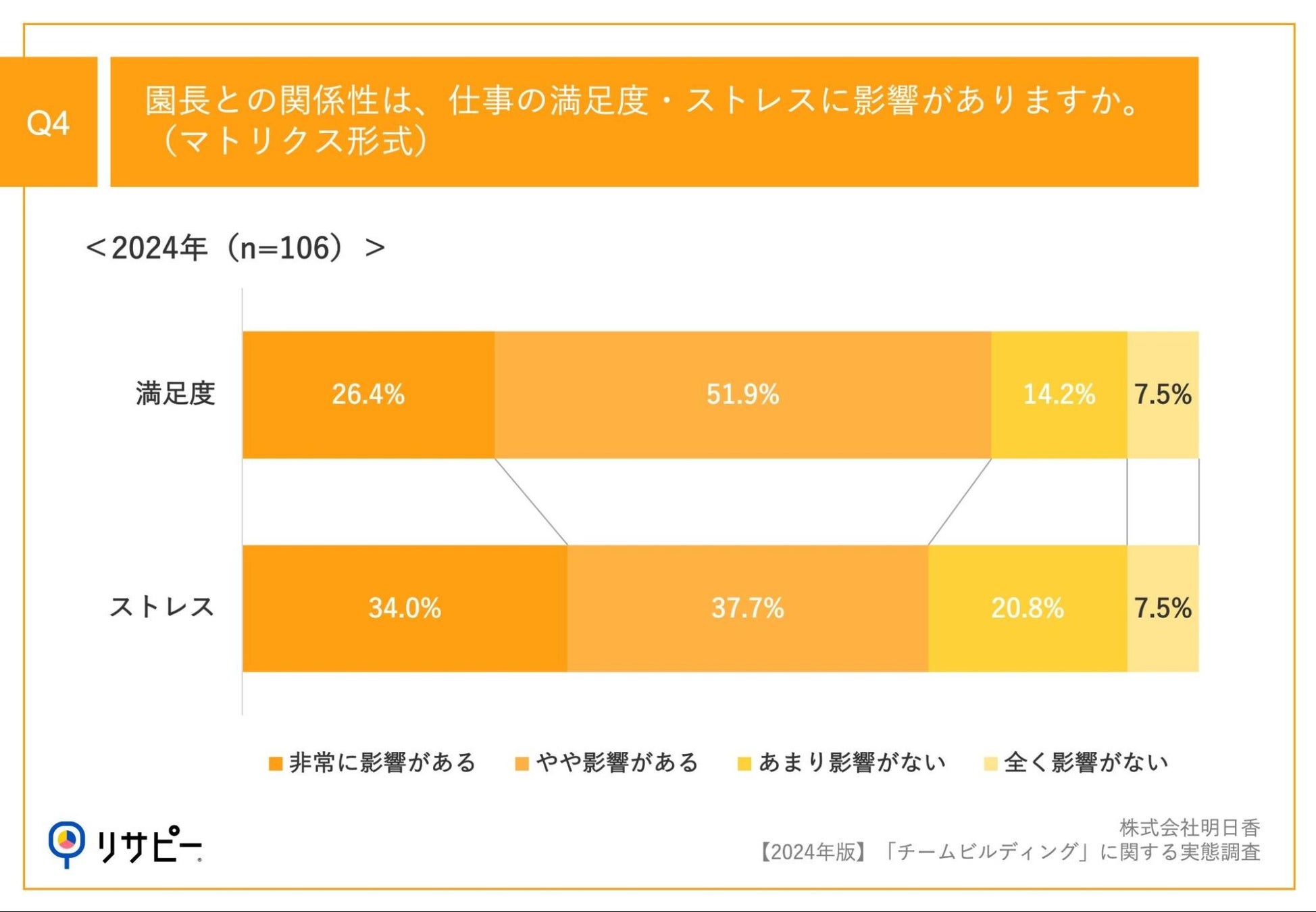 「Q4.園長との関係性は、仕事の満足度・ストレスに影響がありますか。(マトリクス形式)」(n=106)と質問したところ、満足度は「非常に影響がある」が26.4%、「やや影響がある」が51.9%、ストレスは「非常に影響がある」が34.0%、「やや影響がある」が37.7%という回答となりました。