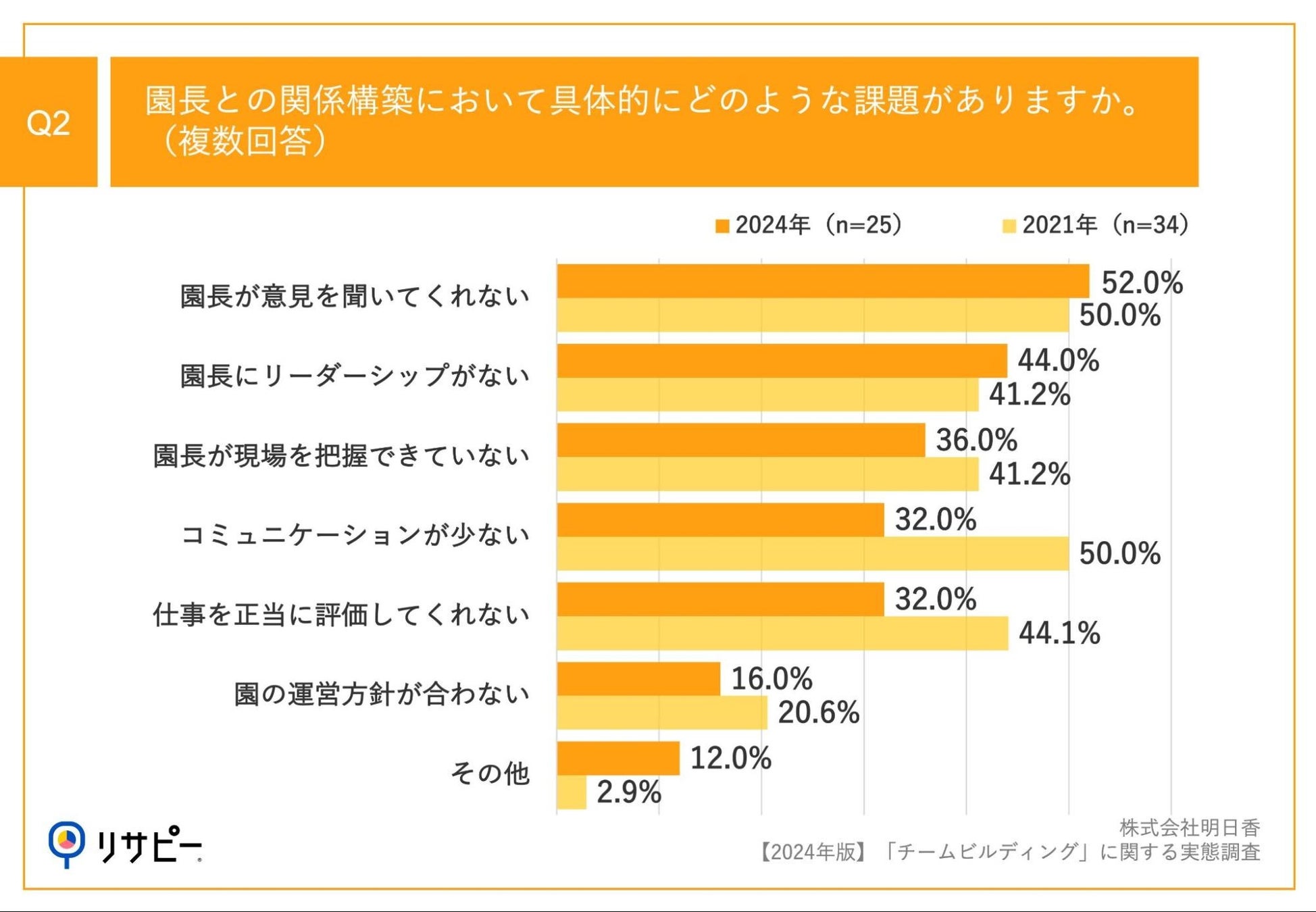 Q1で「全く良好でない」「あまり良好でない」と回答した方に、「Q2.園長との関係構築において具体的にどのような課題がありますか。(複数回答)」(n=25)と質問したところ、「園長が意見を聞いてくれない」が52.0%、「園長にリーダーシップがない」が44.0%、「園長が現場を把握できていない」が36.0%という回答となりました。