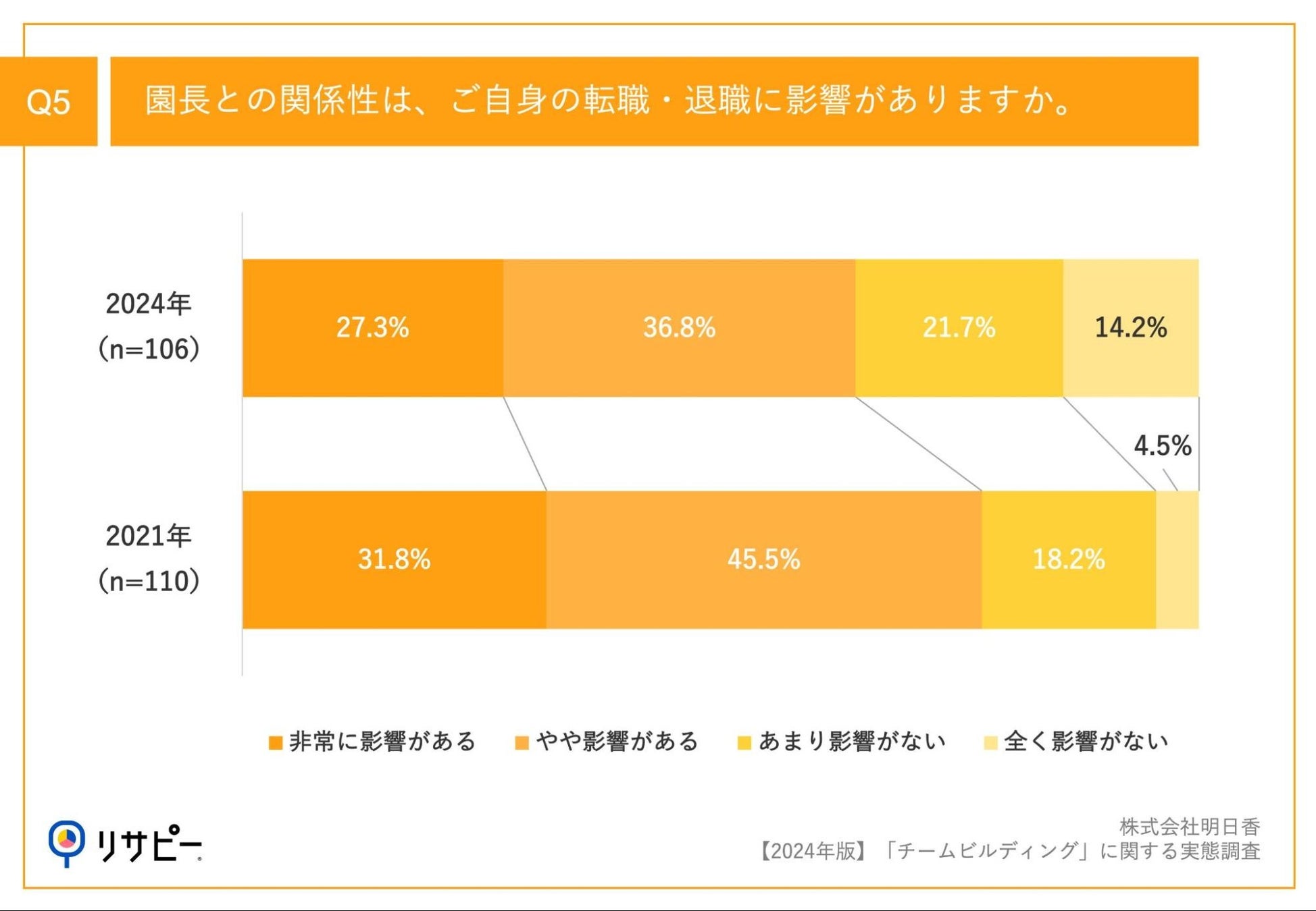 「Q5.園長との関係性は、ご自身の転職・退職に影響がありますか。」(n=106)と質問したところ、「非常に影響がある」が27.3%、「やや影響がある」が36.8%という回答となりました。