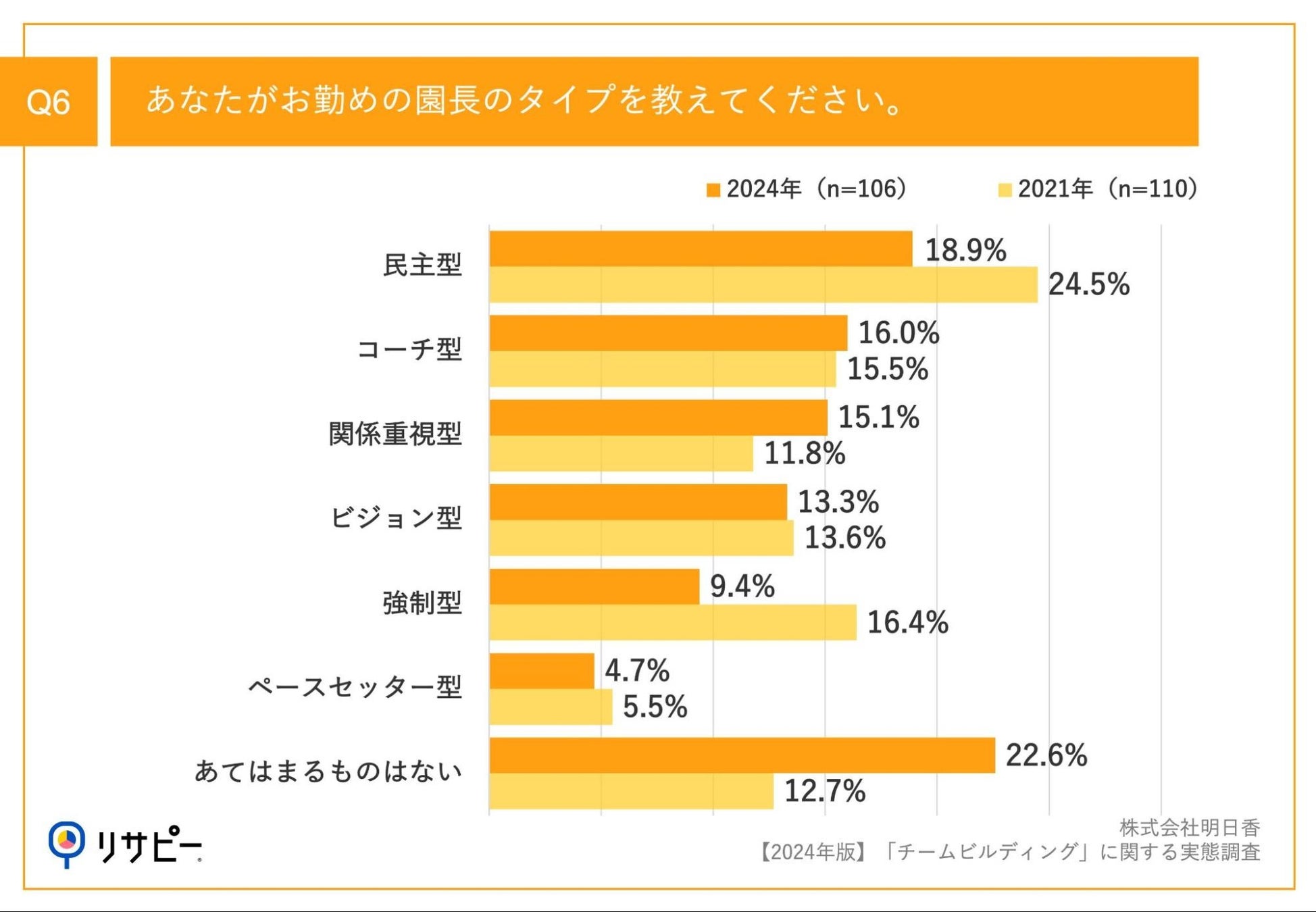 「Q6.あなたがお勤めの園長のタイプを教えてください。」(n=106)と質問したところ、「民主型(職員からの意見や提案を受け入れ、組織の方針に反映するタイプ)」が18.9%、「コーチ型(職員1人1人をよく把握し、各自の能力向上を支援するタイプ)」が16.0%という回答となりました。