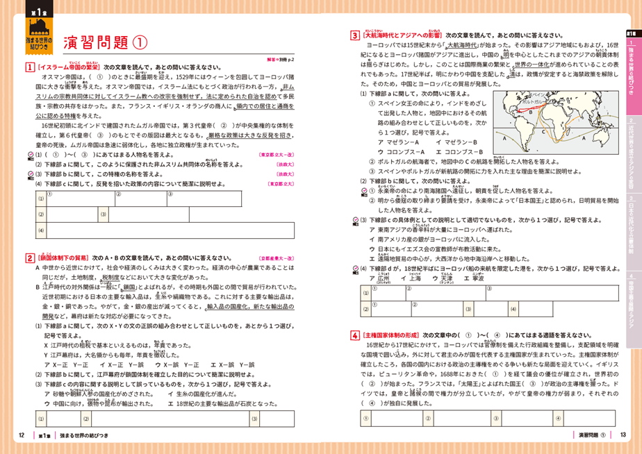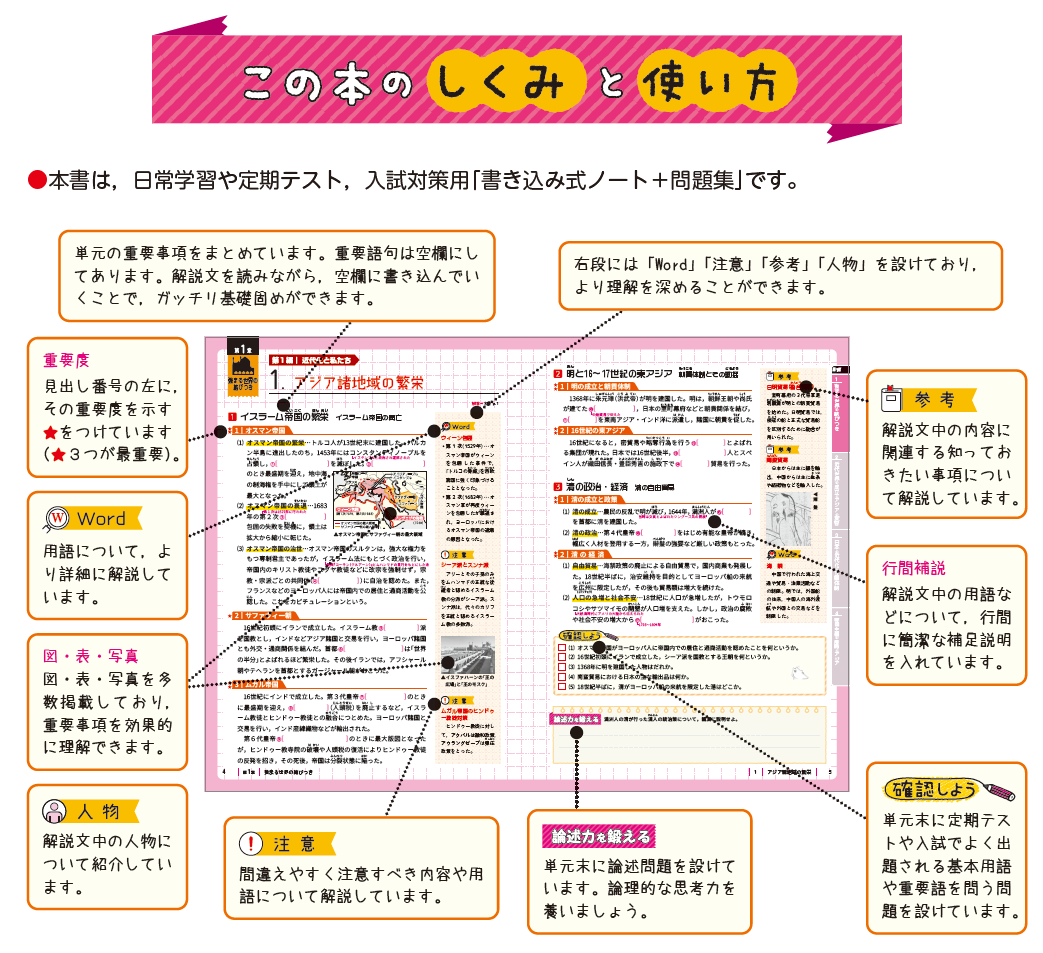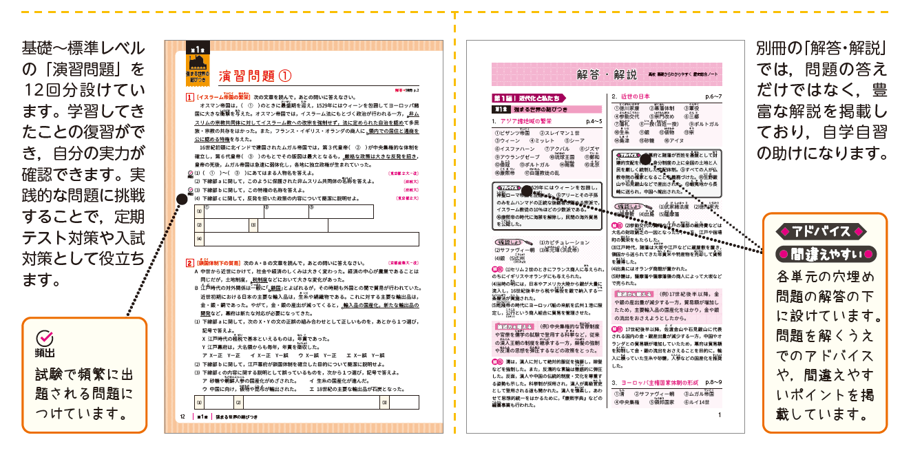 本書は、教科書レベルの内容を中心とした「書き込み式ノート+問題演習」で構成されています。日常学習や定期テスト対策に適しており、授業の復習や教科書の確認に活用しやすくなっています。また、論述問題の「論述力を鍛える」や実戦形式の「演習問題」も用意していますので、大学入試に向けた入門書のようにお使いいただけます。