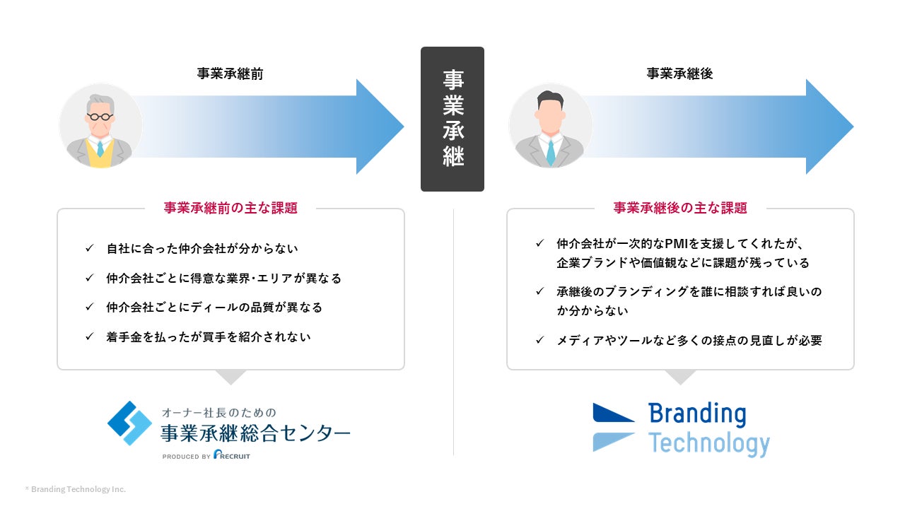 ブランディングテクノロジー株式会社(代表取締役社長:木村裕紀、本社:東京都渋谷区、以下当社)は、株式会社リクルート(代表取締役社長:北村吉弘、本社:東京都千代田区、以下リクルート社)の提供する「オーナー社長のための事業承継総合センター」と業務提携することをお知らせします。両社の業務提携を通じ、中小・地方企業様の事業承継問題をサポートします。