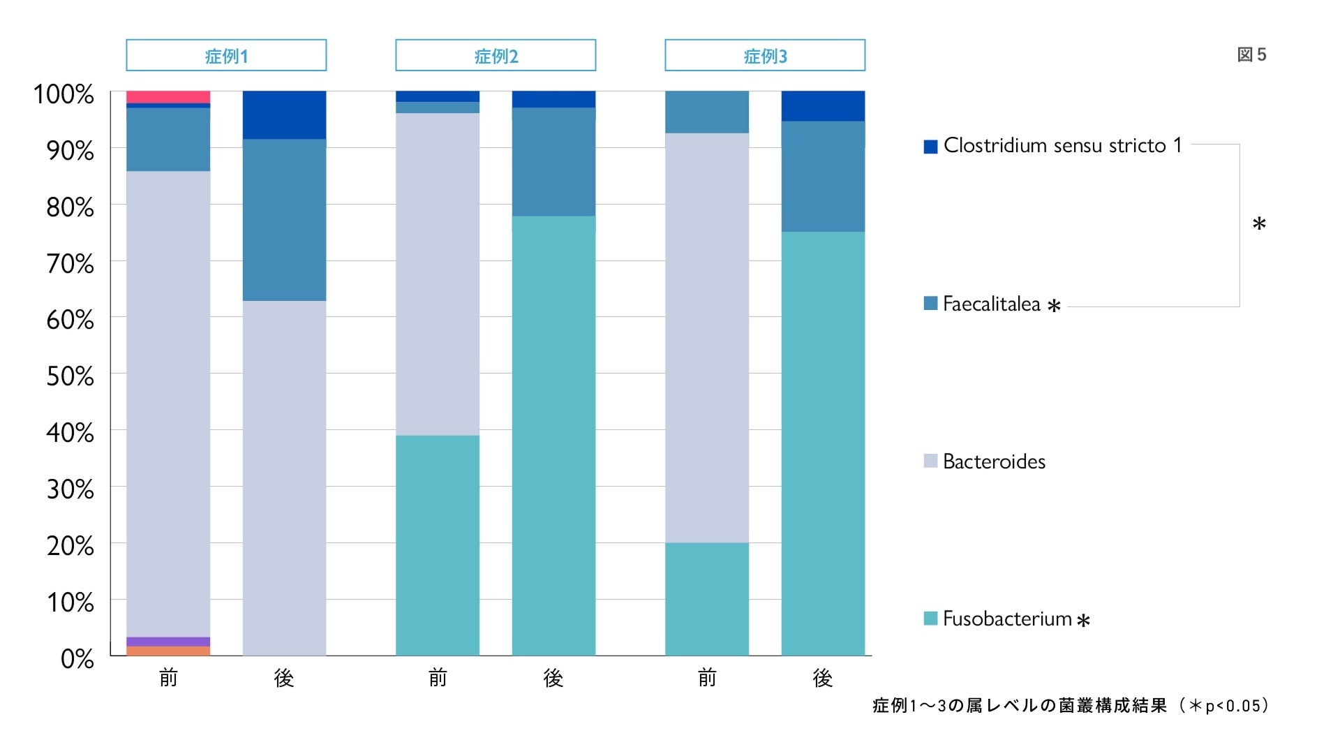 一般家庭で生活している皮膚症状のある犬3頭を対象に、犬のスキンケア用手作り食の給与試験を4週間実施しました。手作り食の主な原材料は、鹿肉、豚肉、サツマイモ、カボチャ、ニンジン、舞茸、ビーツ、ケール、真鯛オイル、ウコン粉末、寒天、ごま、フィッシュオイル、昆布、殺菌乳酸菌/ビタミン類、ミネラル類です。結果、3例中2例で、痒みまたは皮膚症状の改善が認められ(図1〜4)、さらに腸内細菌叢において有用菌である3種の酪酸産生菌が増加し、非有用菌で炎症を促進するBacteroidaceae属が減少しました(図5)。α多様性は、症例1および3について高まりました。以上より、症例数は少ないものの、食物アレルギーを含めた皮膚症状のある犬において、原料の関係で状態を改善させる可能性が示唆されました。