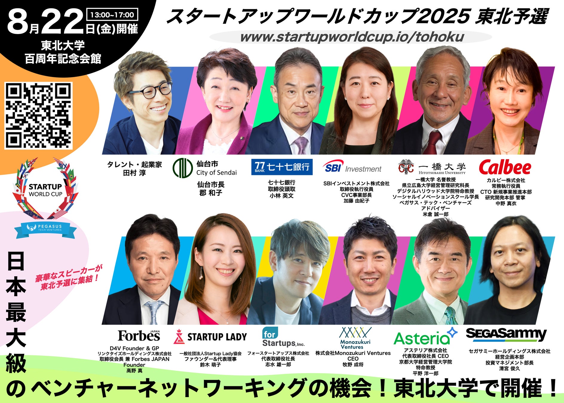 東北予選では会場とオンラインを合わせて約2,000名の視聴者が見込まれており、日本を代表する各界のリーダーや著名人が多数登壇し、東北と世界を繋ぐスタートアップエコシステムを盛り上げます。