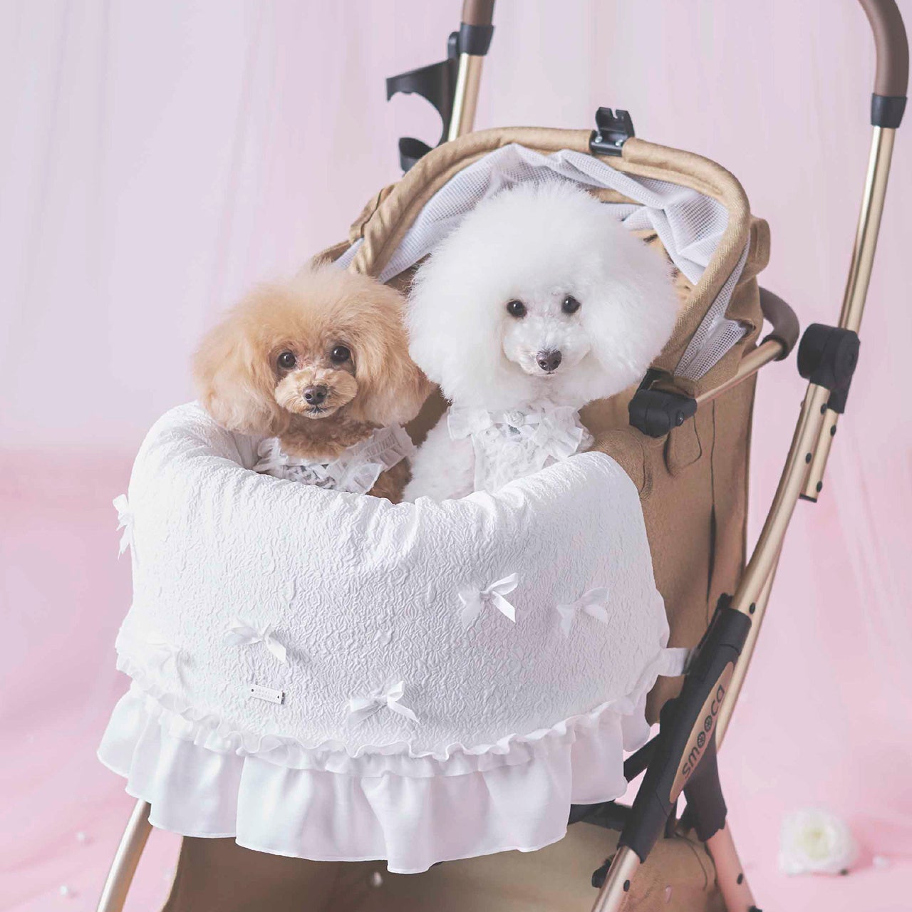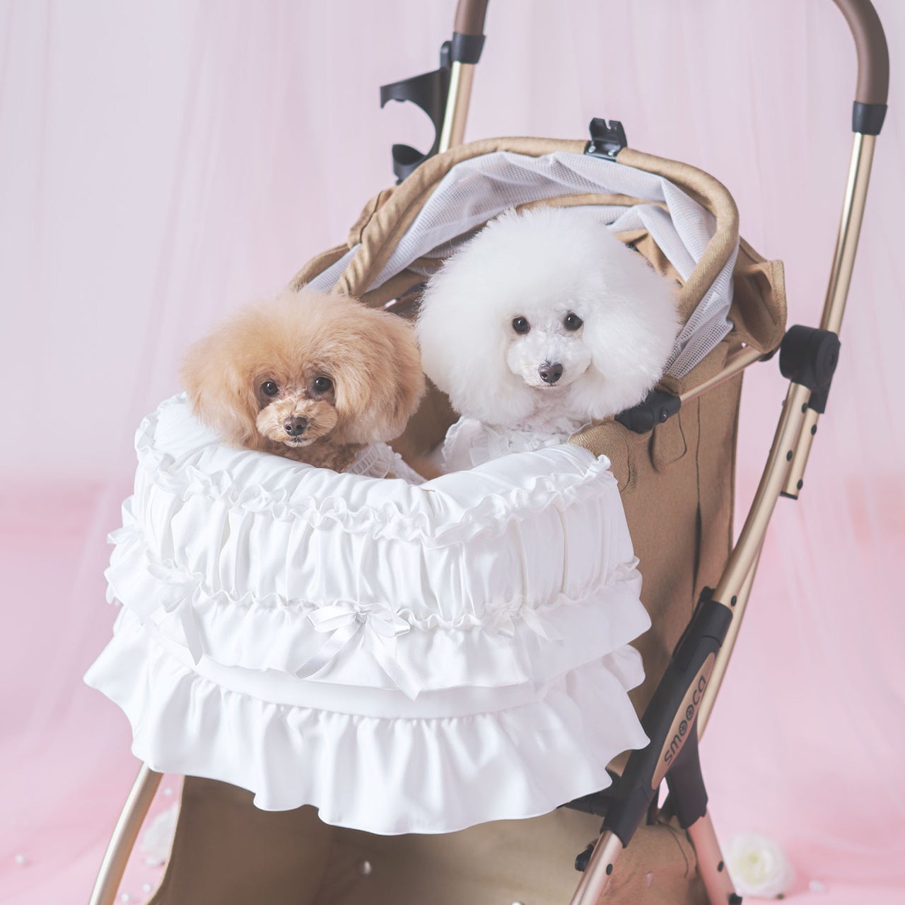 お散歩の時間をより快適にするアイテムとして、カート用クッションを初めて発売します。ギャザーやフリル、リボンをふんだんにあしらった贅沢なデザインです。リバーシブル仕様で、フリルが際立つ「フェミニンスタイル」と、小さなリボンをちりばめた「キュートスタイル」の双方をお楽しみいただけます。当社で展開しているペットカート「スムーカ」とも非常に相性の良いアイテムです。