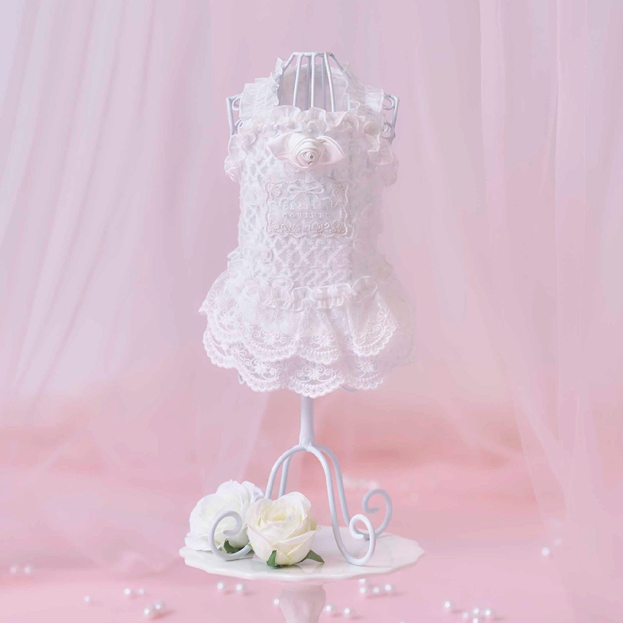 背中のギャザークロスデザインやスカラップレースのリボンをポイントにしたデザインです。スカート部分に、軽やかさと適度なハリを兼ね備えたオーガンジー素材を使用することにより、ボリューム感があるシルエットを実現しました。また、愛犬の肌に触れる部分には接触冷感機能のある生地を採用しているため、夏場でも涼しく快適に着用できます。