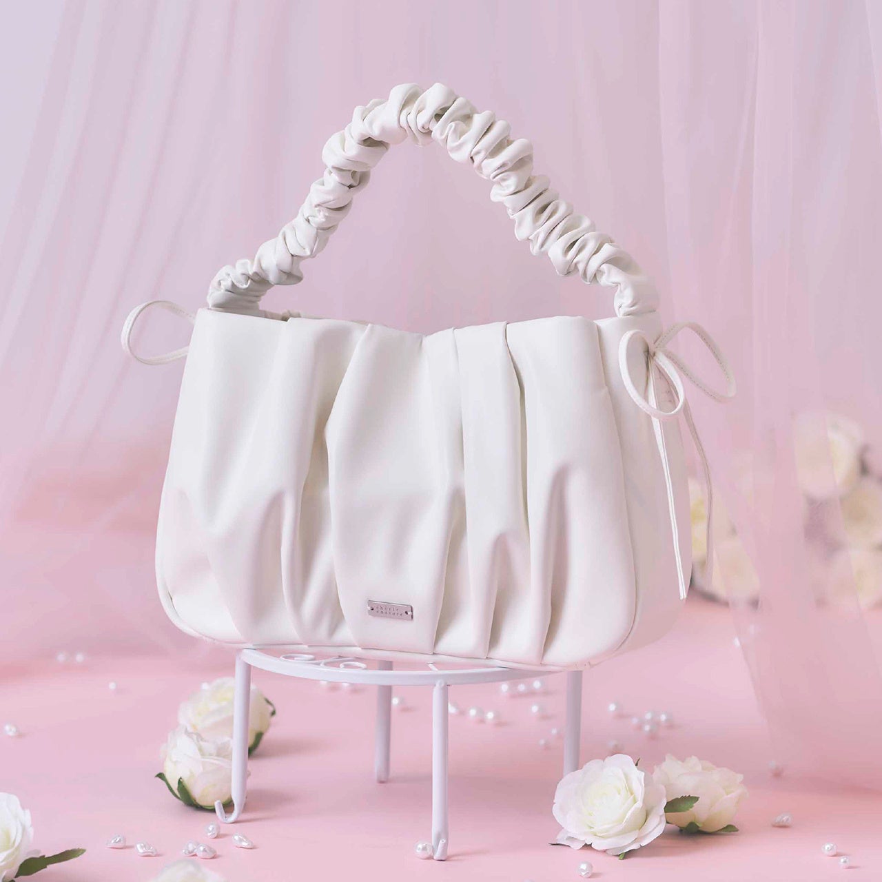 ラグジュアリーなブランドの世界観を崩さずに、オーナー様が日常で使いやすいシンプルなデザインを追求しました。柔らかくもっちりとした質感の素材を使用し、ギャザーやタックの量を微調整することで、特別感のある佇まいに仕上げております。一見するとファッションバッグのような見た目ですが、内側にはボトルホルダーやポケットを備えており、十分な収納スペースを確保しました。付属のテープを使用することでカートのハンドルに固定することが可能になります。