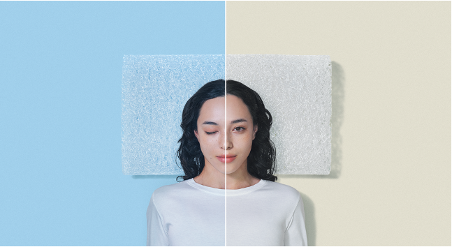 頭の大きさや重さに合わせてフィットする“アジャスト層”、頭や首をしっかり支える“サポート層”下からも空気が抜ける“ベース層”と、3種の繊維が異なる樹脂が重なった理にかなった構造になっています。首元は沈み込みやすいやわらかさに、両端は少し硬く、横向きに寝てもしっかりフィットし、寝返りが打ちやすく仕上げています。