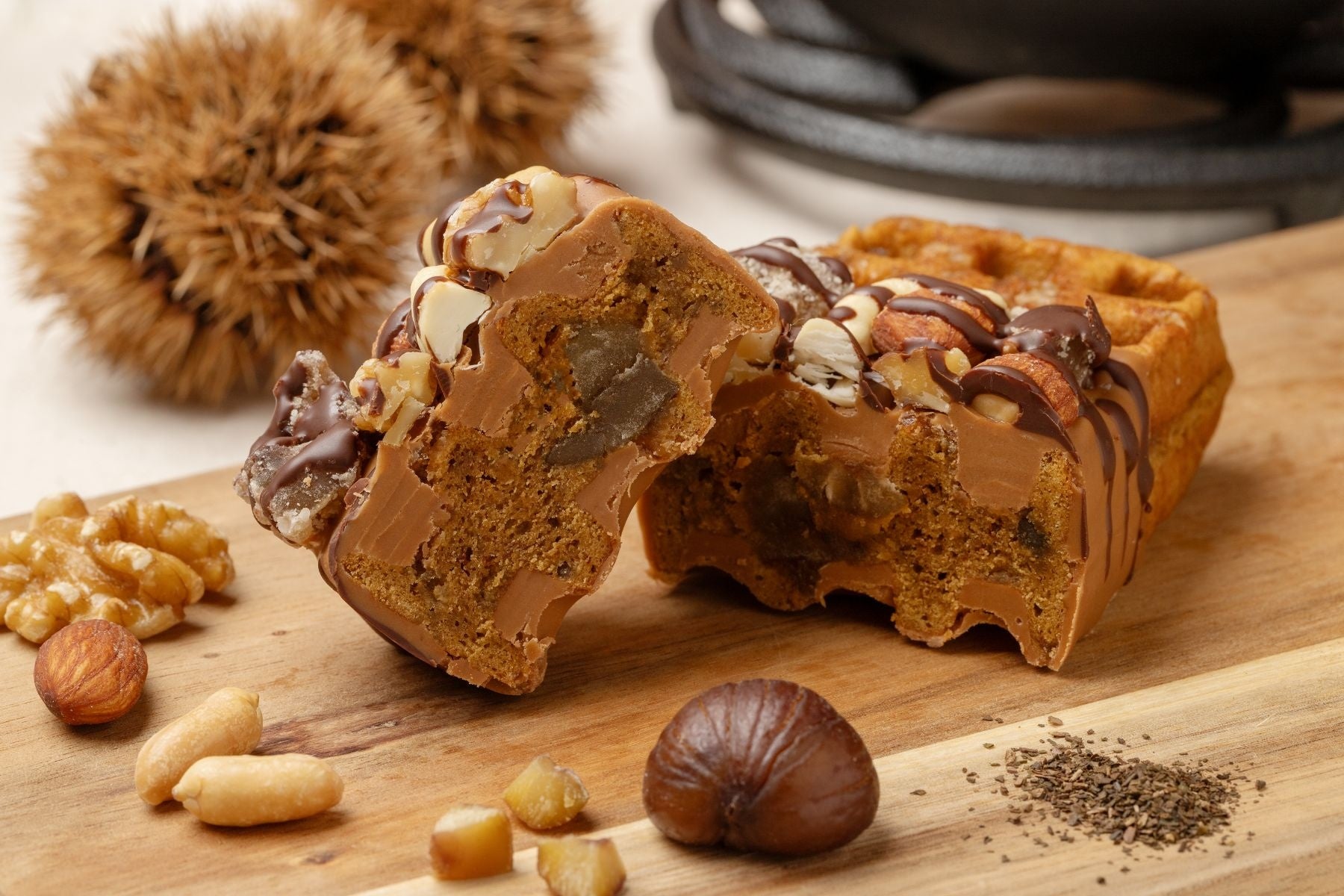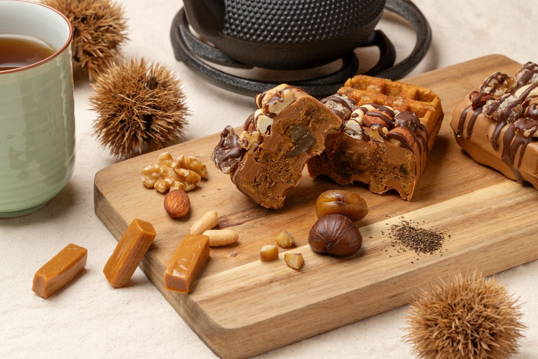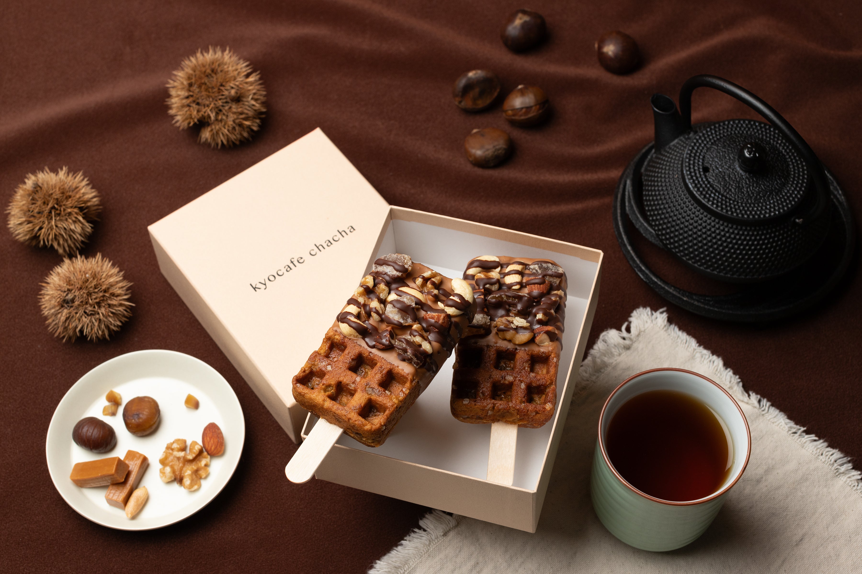 大粒のザラメとほうじ茶に加え、贅沢にマロングラッセを練り込んだしっとりなめらかな京ワッフルの生地。噛んだ瞬間「パキッ」と音が鳴るほど、キャラメルチョコレートを分厚くコーティング。その上からミルクチョコレートを垂らし、大きく砕いたナッツに加え、マロングラッセを贅沢にトッピング。