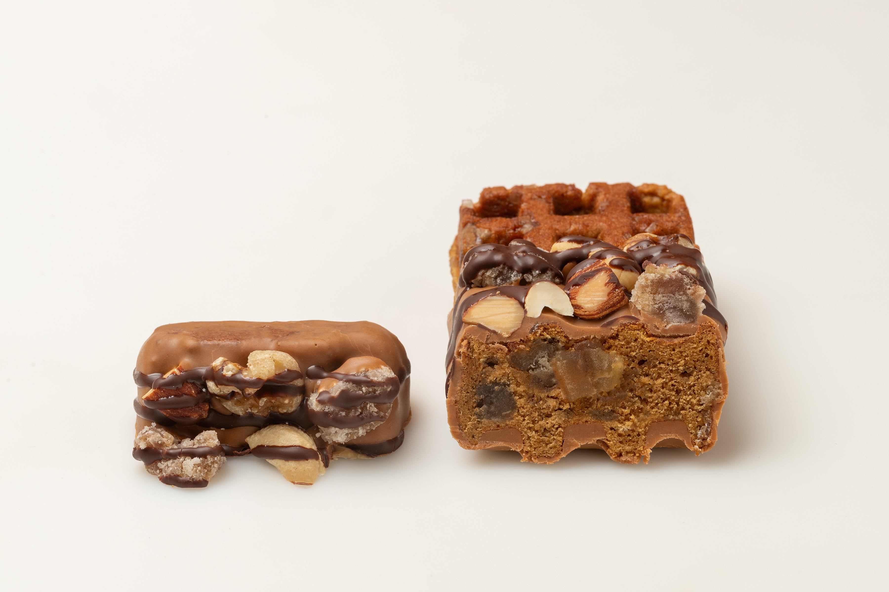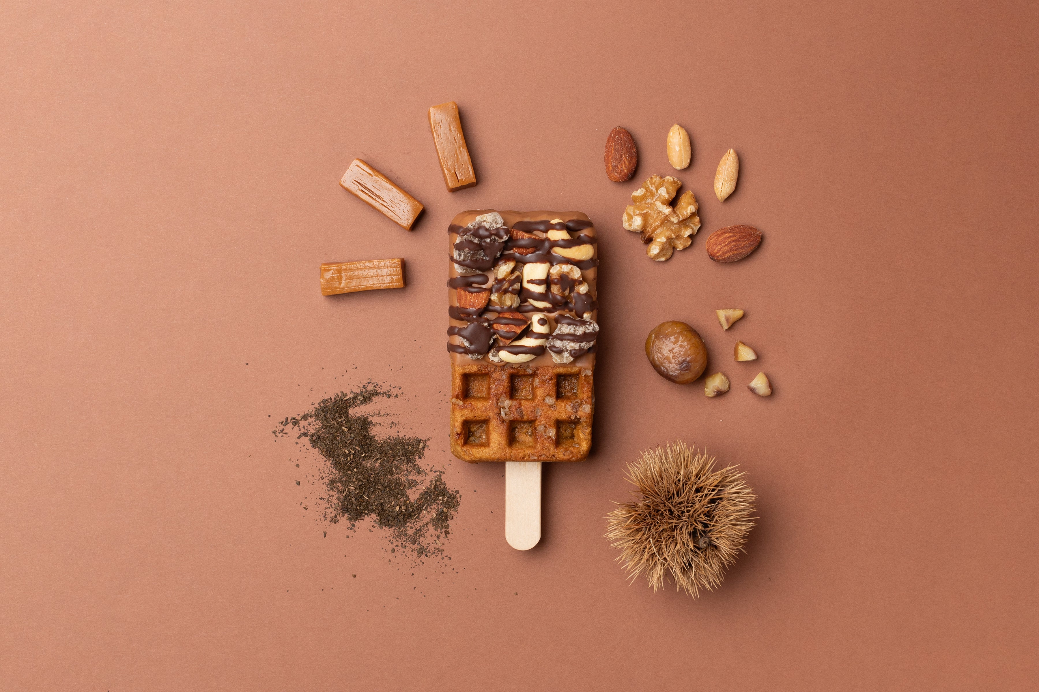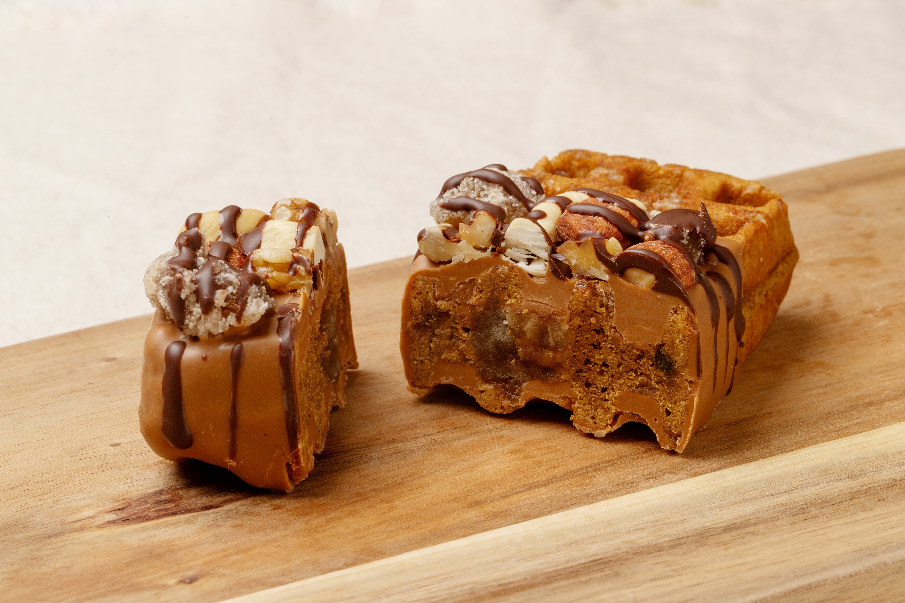 大粒のザラメとほうじ茶に加え、贅沢にマロングラッセを練り込んだしっとりなめらかな京ワッフルの生地。噛んだ瞬間「パキッ」と音が鳴るほど、キャラメルチョコレートを分厚くコーティング。その上からミルクチョコレートを垂らし、大きく砕いたナッツに加え、マロングラッセを贅沢にトッピング。