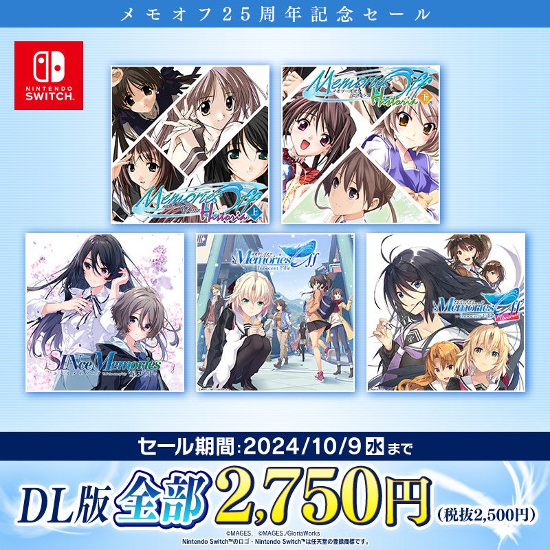 株式会社MAGES.(東京都港区 代表取締役社長:本荘健吾)は、恋愛アドベンチャーゲーム「メモリーズオフ」の発売25周年を記念して、ニンテンドーeショップにてダウンロード版メモリーズオフシリーズ全タイトルの期間限定セールを開始したことをお知らせいたします。