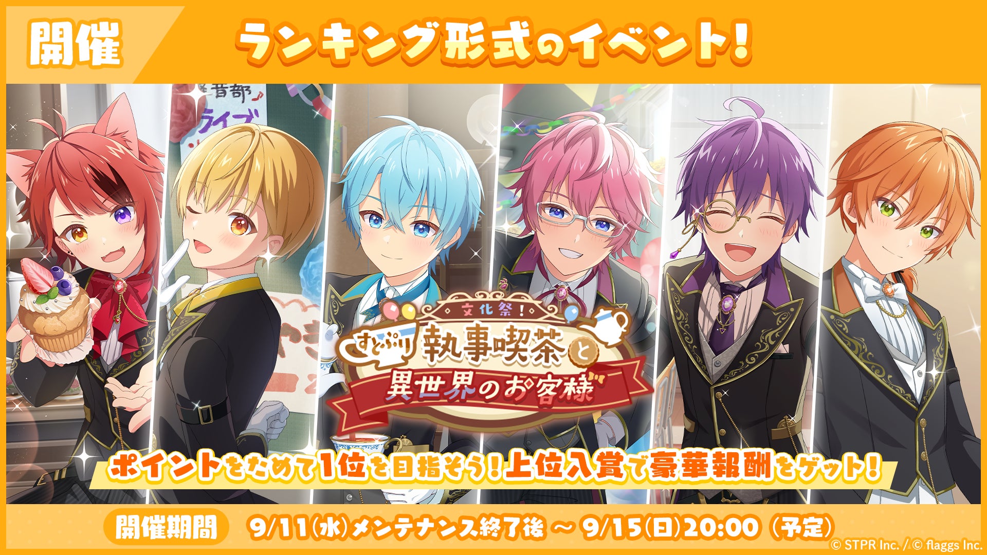株式会社flaggs(フラッグス)(本社:東京都品川区、代表取締役CEO:吉江 直人)と株式会社STPR(本社:東京都渋谷区、代表取締役:柏原 真人、以下STPR)は、本日9月11日(水)に2.5次元アイドルグループ「すとぷり」の公式ゲームアプリ「すとぷりWith!!(通称:すとうぃず)」のゲーム内イベント「文化祭!すとぷり執事喫茶と異世界のお客様 応援イベント」の開催についてお知らせいたします。