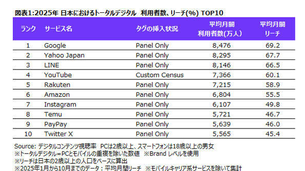 まず、2025年のデジタルサービスの利用動向としてPCとモバイルの重複を除いたトータルデジタルのリーチと利用者数に着目すると、上位3サービスの「Google」「Yahoo Japan」「LINE」は8,000万人を超え、人口の60%以上にリーチするサービスとなっています。EC分野では、「Temu」は5,721万人が利用し、8位と新たにTOP10に加わりました(図表1)。