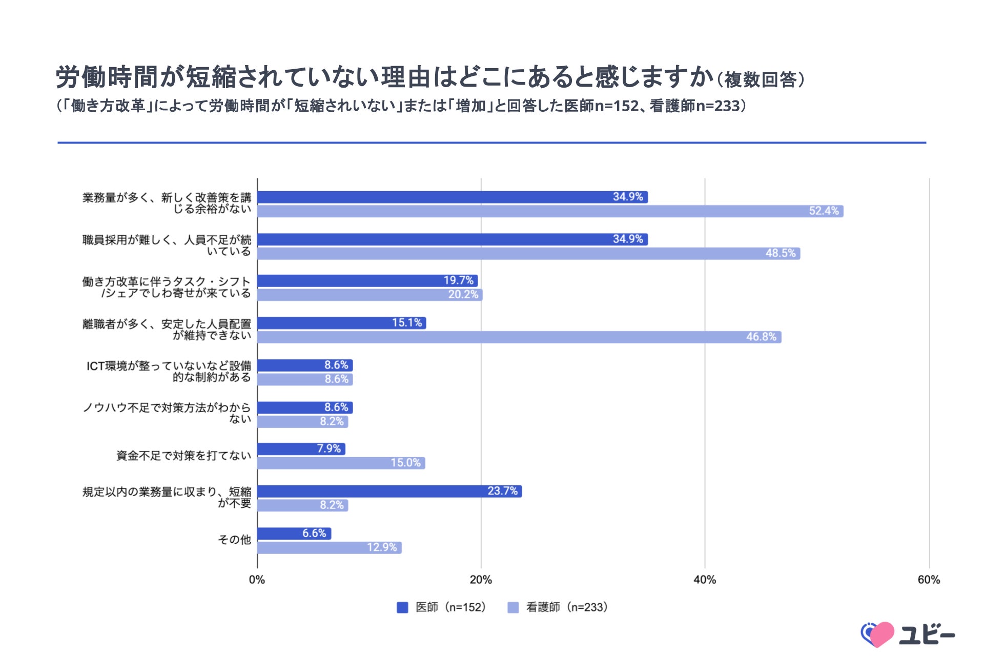 労働時間が短縮されない理由について、医師からは「業務量が多く、新しく改善策を講じる余裕がない」「職員採用が難しく、人員不足が続いている」(ともに34.9%)が最も多く挙げられました。