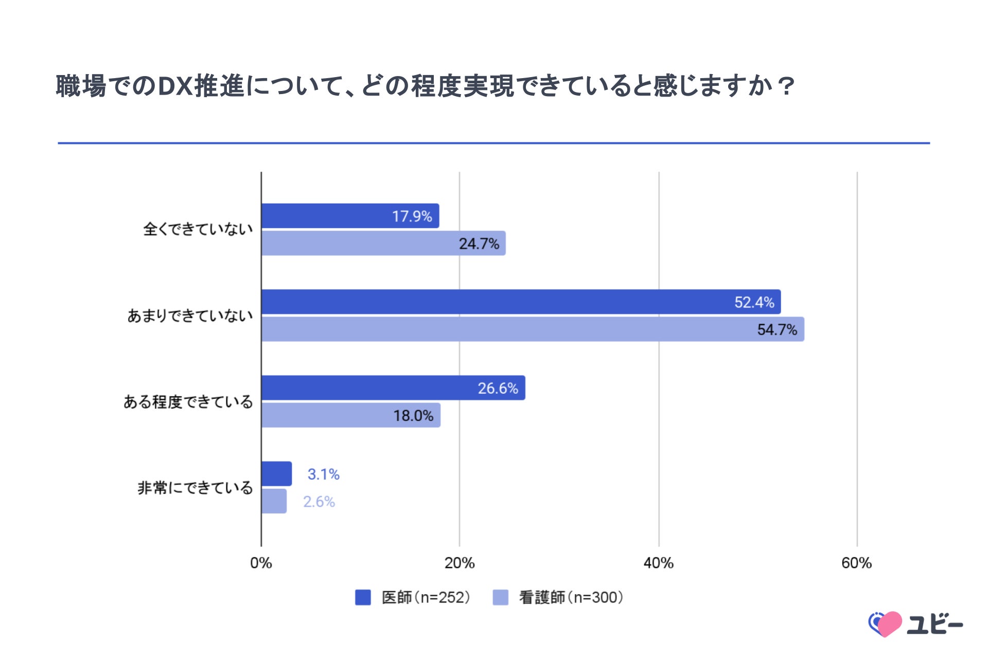 ・医療機関でのDX推進が「不十分」と感じる割合は医師70.3%(全くできていない17.9%、あまりできていない52.4%)、看護師は79.4%