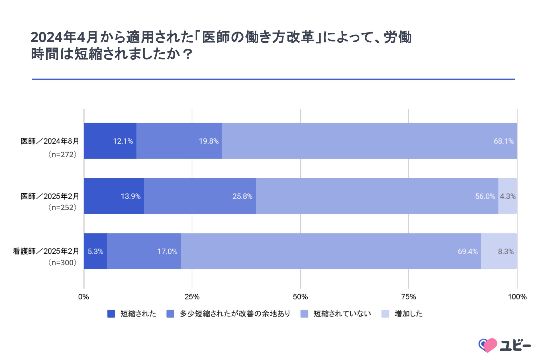 Ubie株式会社(本社:東京都中央区、共同代表取締役:阿部吉倫・久保恒太、以下「Ubie」)は、2024年4月に施行された「医師の働き方改革」から約1年が経過したことを受け、全国の病院に勤務する医師を対象に「医療現場の働き方に関する意識調査」を実施しました。調査の結果、労働時間が短縮された・多少短縮された医師の割合は39.7%(前回調査比+7.8ポイント)と、改善の兆しが見られたものの、依然として60.3%が労働時間短縮を実感できていない状況が明らかになりました。