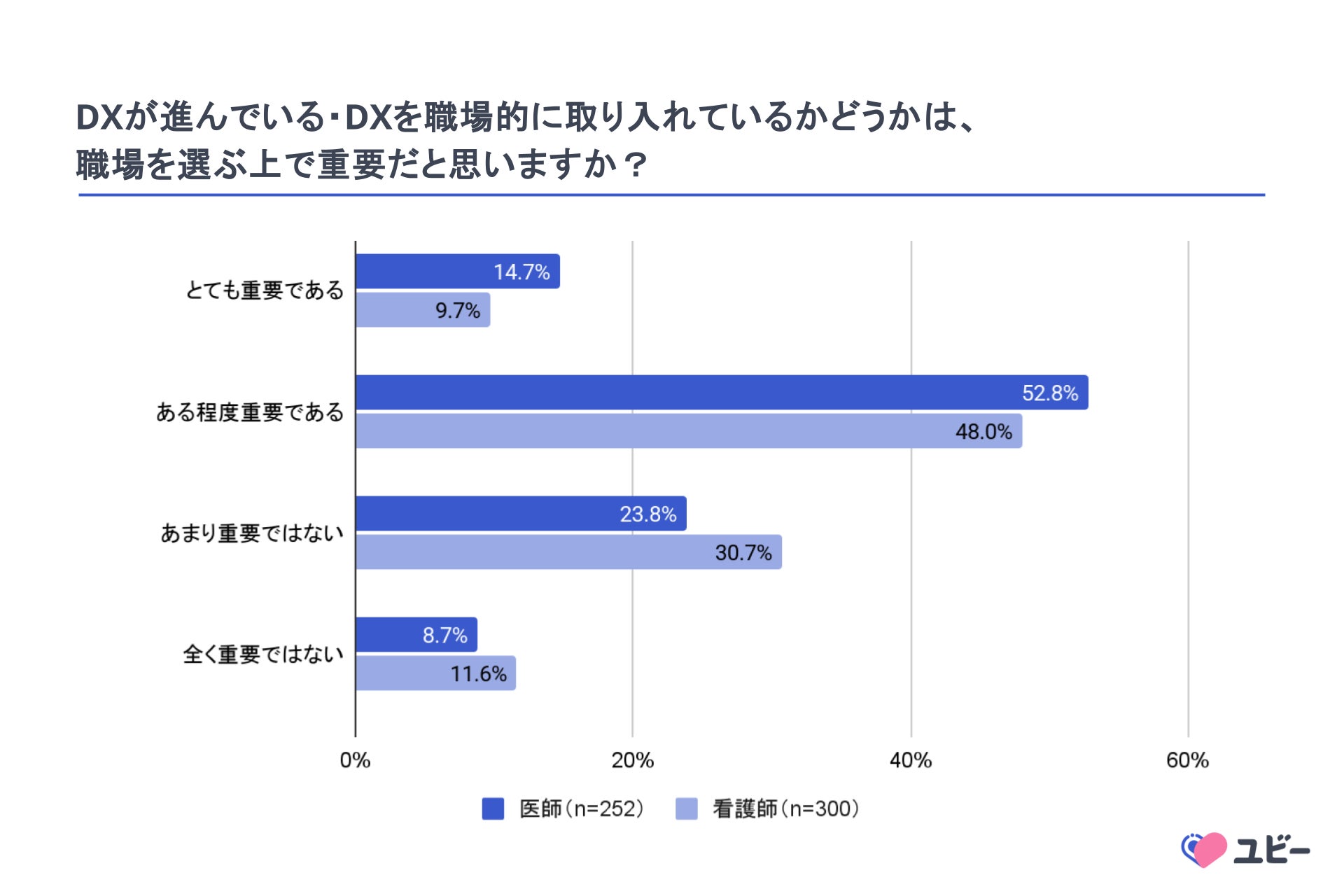 医療機関でのDX推進について、医師の70.3%、看護師の79.4%が「全くできていない」「あまりできていない」と回答。一方で、DXの推進状況が「職場を選ぶ上で重要」と回答した割合は医師67.5%、看護師57.7%に上り、DXへの関心の高さが表れる結果となりました。