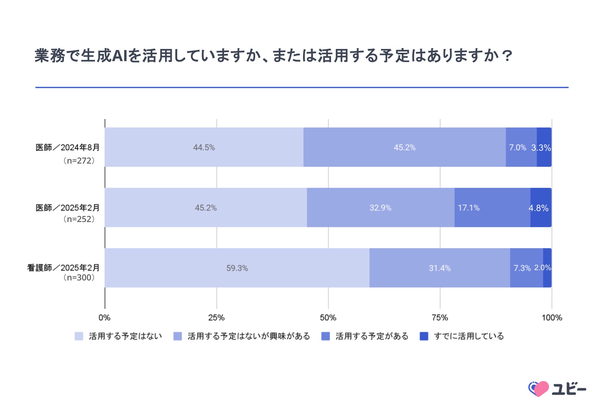 今回の調査結果では、医師の働き方改革施行から1年が経過し、わずかながら改善の兆しが見られるものの、医療現場全体の労働環境改善には依然として課題が残されていることが明らかになりました。一方で、医師・看護師ともにAI技術による業務効率化に高い期待を寄せている点、医師の生成AI活用予定者がわずか半年で2倍に増加したことは、DXが今後の医療機関の運営の鍵となることを示唆しています。当社も引き続き、業務効率化支援サービス『ユビー生成AI』等の提供を通じ、医療現場の皆様の効率化と働きやすい環境づくりにより一層貢献してまいります。