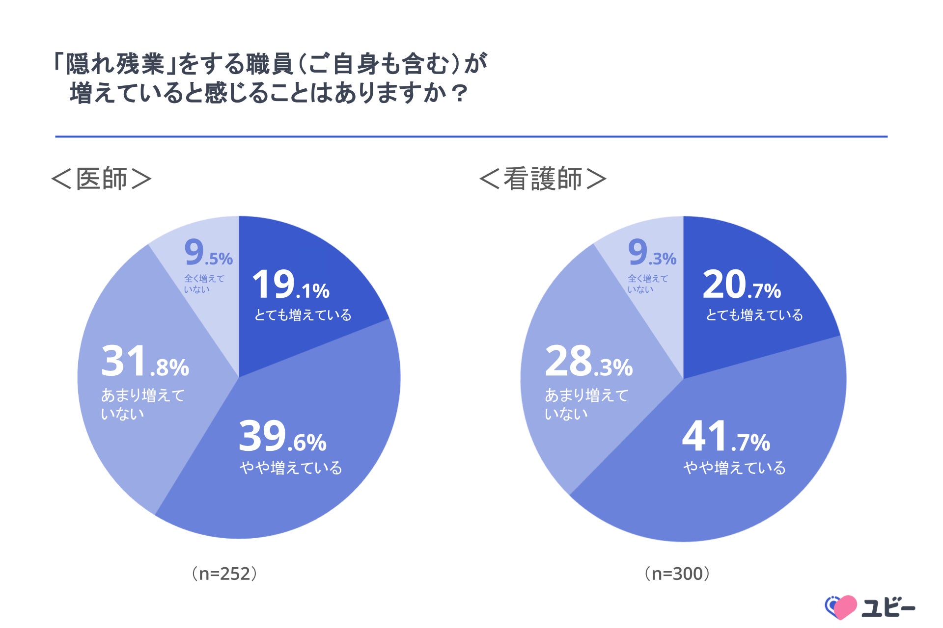 ・「隠れ残業」をする職員が増えていると感じる割合は医師58.7%、看護師62.4%