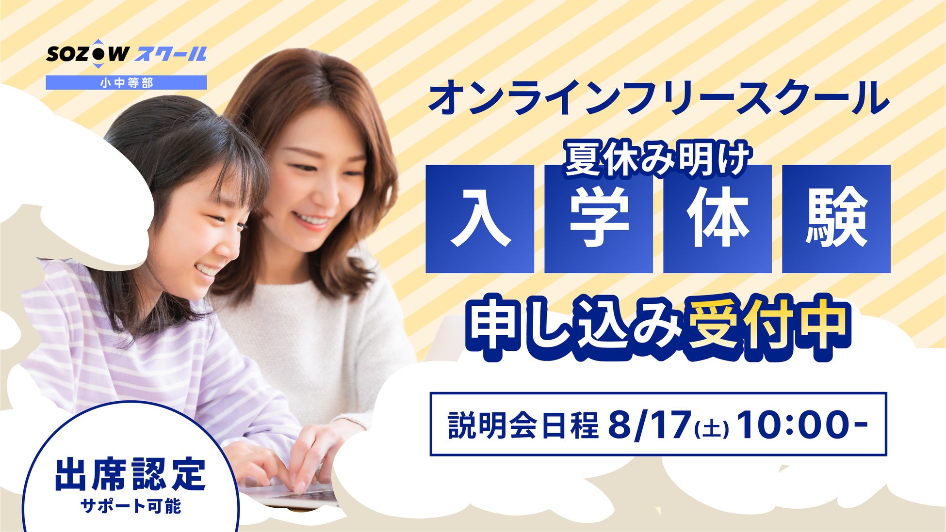 「好奇心を解き放ち、自分らしい未来をSOZOWできる社会をつくる」をビジョンに掲げるSOZOW株式会社(所在地:東京都品川区、代表取締役:小助川 将)は、運営するオンラインフリースクール「SOZOWスクール小中等部」にて、8月29日(木)〜9月10日(火)に入学体験を実施することを決定いたしました。入学体験に関する説明会は、8月17日(土)10時にオンラインにて開催いたします。