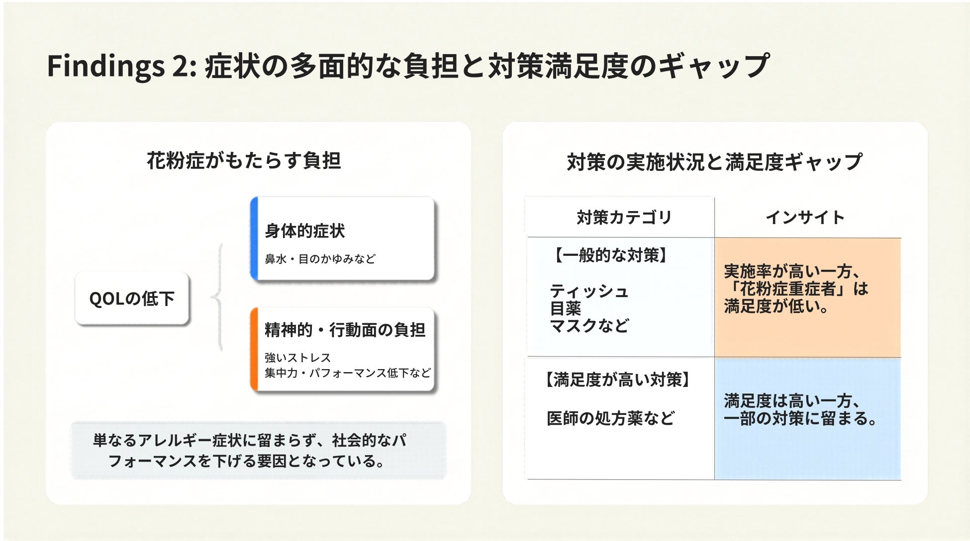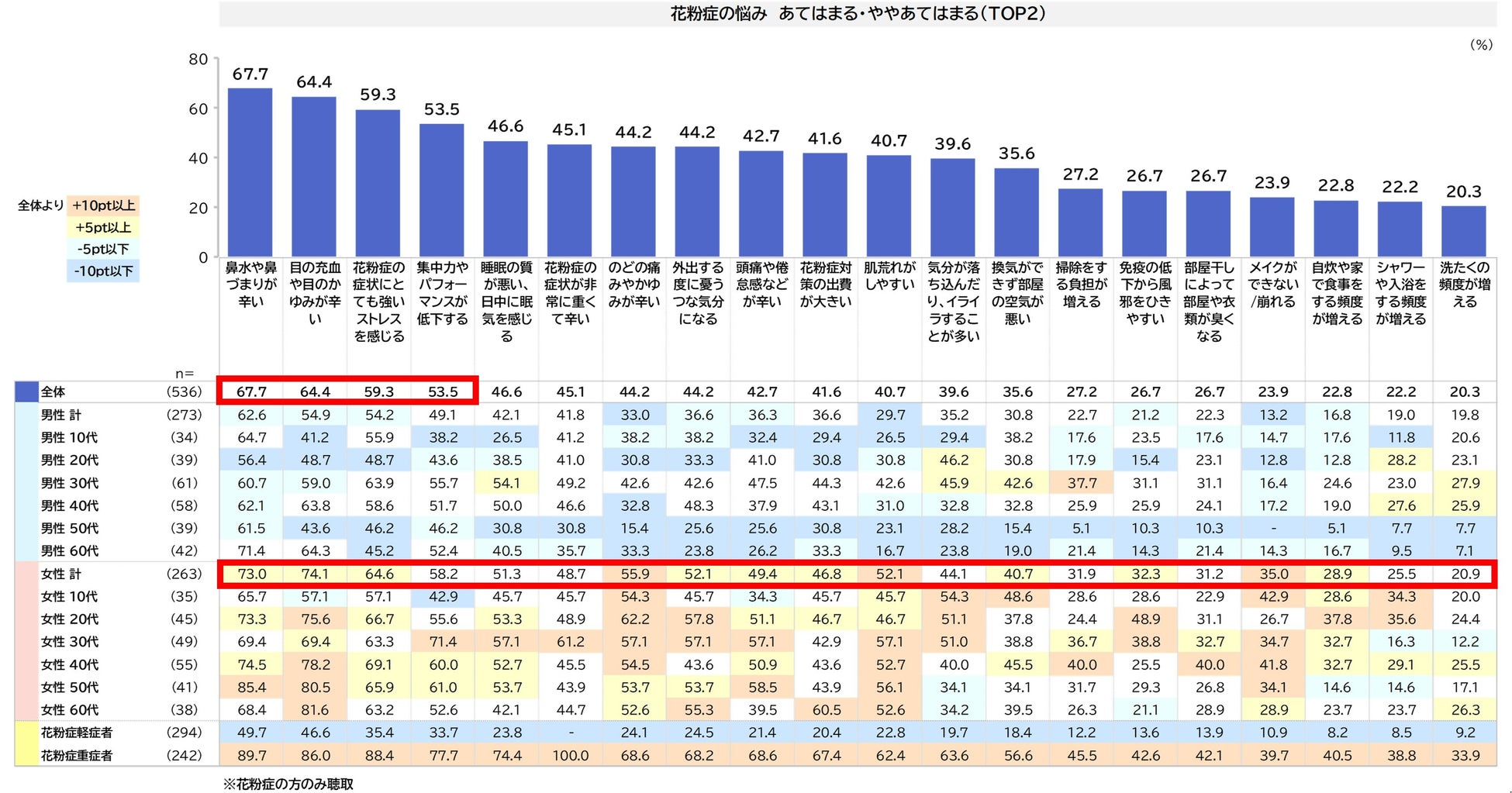 花粉症患者の多くは「鼻水・鼻づまり」「目のかゆみ」などの身体的症状に加え、「花粉症症状に強いストレスを感じる」「集中力やパフォーマンスが低下する」といった精神的・行動面での負担を抱えている。