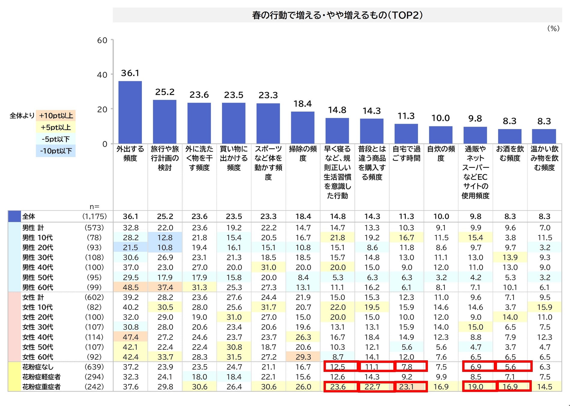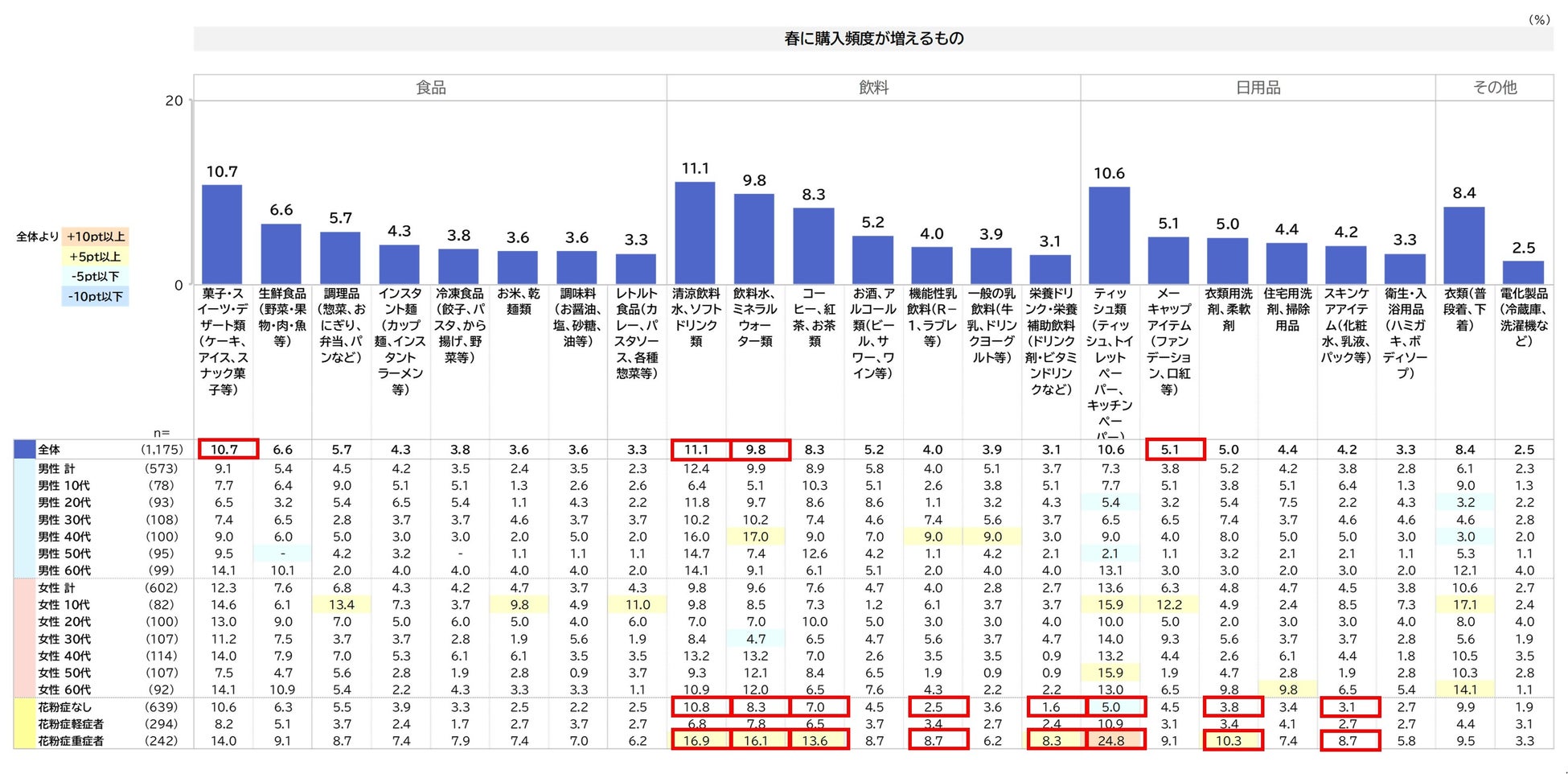 春に購入頻度が増加しているものを見ると、全体では「清涼飲料水、ソフトドリンク類」、「菓子・スイーツ・デザート類(ケーキ、アイス、スナック菓子等)」、「ティッシュ類(ティッシュ、トイレットペーパー、キッチンペーパー)」、「飲料水、ミネラルウォーター類」が飲料を中心として上位に上がりました。属性別に見ると「花粉症重症者」は「花粉症なし」と比較して「ティッシュ類(ティッシュ、トイレットペーパー、キッチンペーパー)」の選択率が4倍以上高く、「清涼飲料水、ソフトドリンク類」、 「飲料水、ミネラルウォーター類」、 「コーヒー、紅茶、お茶類」、「衣類用洗剤、柔軟剤」、「スキンケアアイテム(化粧水、乳液、パック等)」、「機能性乳飲料(R-1、ラブレ等)」、「栄養ドリンク・栄養補助飲料(ドリンク剤・ビタミンドリンクなど)」が5pt以上高くなりました。FMCG市場では上記のジャンルが花粉症の影響で購入頻度が増加傾向となっている可能性が推察されます。