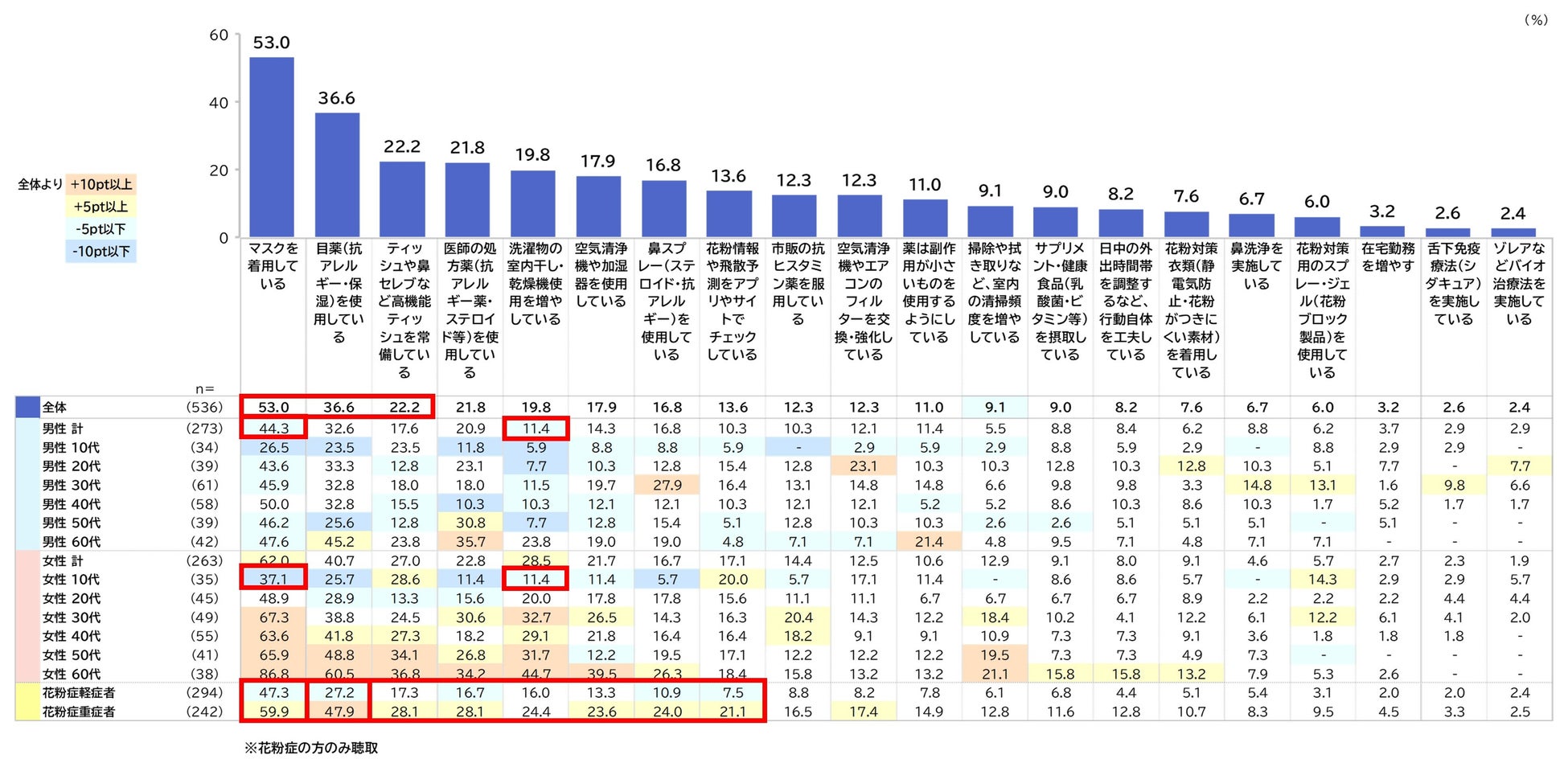 全体で見ると「マスクを着用している」、「目薬(抗アレルギー・保湿)を使用している」、「ティッシュや鼻セレブなど高機能ティッシュを常備している」が上位に並びました。属性別に見ると、「花粉症重症者」は「花粉症軽症者」と比較して、全体的に対策の実施割合が多い傾向が伺えます。特に、「目薬(抗アレルギー・保湿)を使用している」では20pt以上の差があります。また、男女別では女性の方が「マスクを着用している」や「洗濯物の室内干し・乾燥機使用を増やしている」の選択率が高い傾向が伺えます。