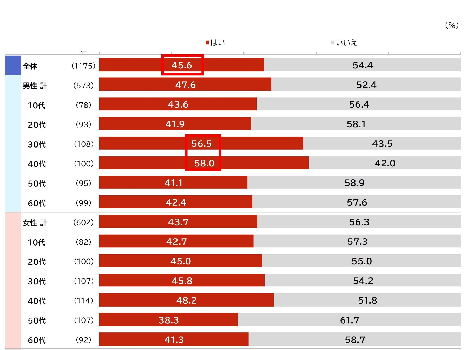 花粉症患者の割合は全体で45.6%となっており、男性は47.6%、女性は43.7%となりました。30代男性、40代男性は全体と比べて10pt以上差をつけて高い傾向でした。