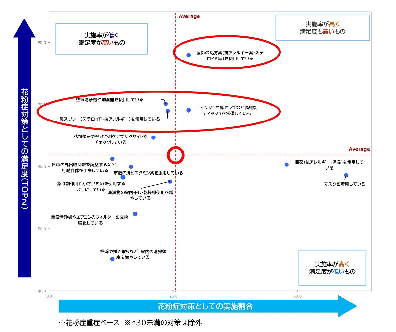 花粉症重症者のみで満足度を見ると、「医師の処方薬(抗アレルギー薬・ステロイド等)を使用している」が最も高く、「空気清浄機や加湿器を使用している」、「ティッシュや鼻セレブなど高機能ティッシュを常備している」、「鼻スプレー(ステロイド・抗アレルギー)を使用している」が次いで満足度が高い結果となりました。全体ベースと比較すると、アベレージの交点が右下側によっており、「花粉症重症者」は対策実施割合は高いものの、満足度は低い様子が伺えます。